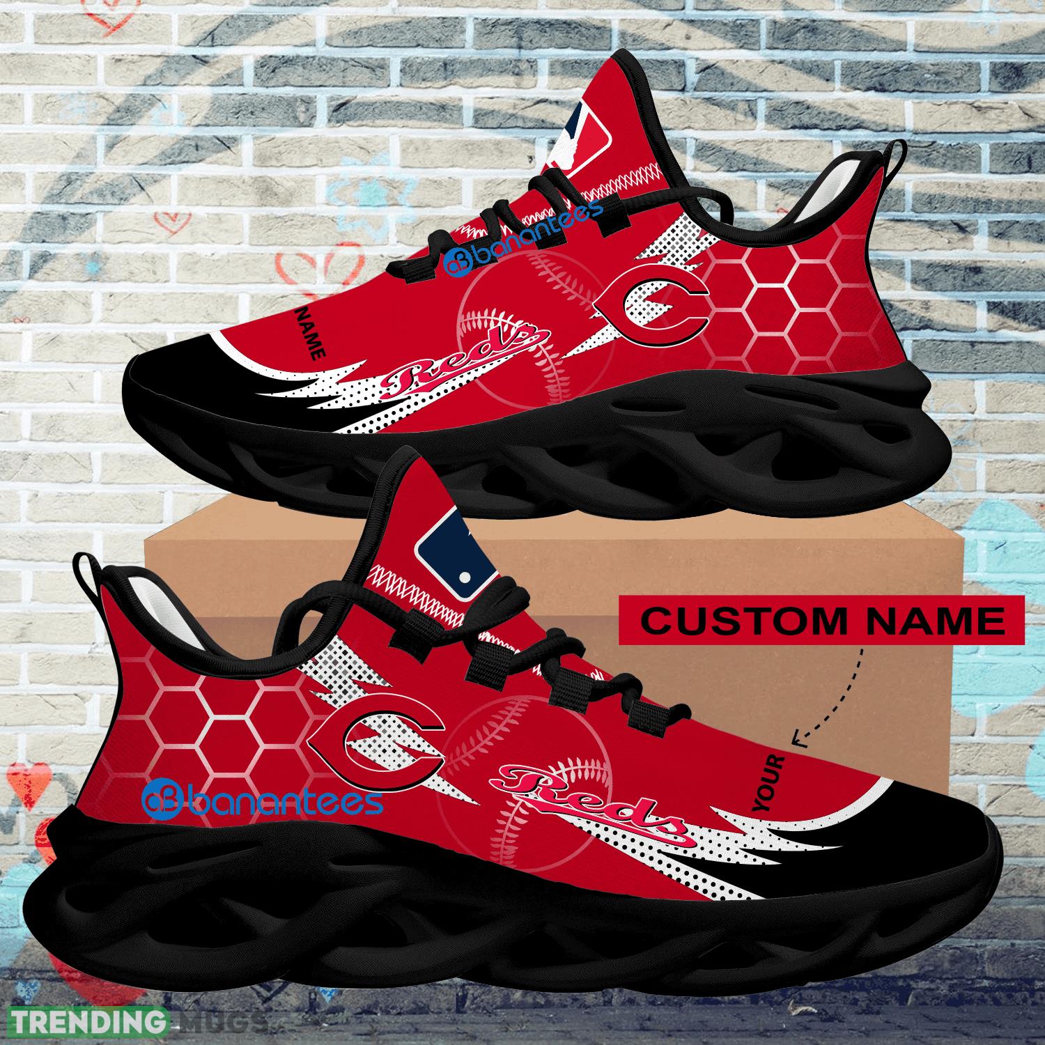 This Personalized MLB Cincinnati Reds Hexagonal Pattern Max Soul Shoes New Gift Sports Sneakers is a breathable, lightweight, and comfortable casual outdoor shoe that has a unique design. It is made of a mesh fabric which makes it sweat absorbent and breathable, while the rubber bottom ensures traction, comfort, and durability. It is available in two colors: black or white sole. There are two styles of shoelace holes so you can choose your preference.