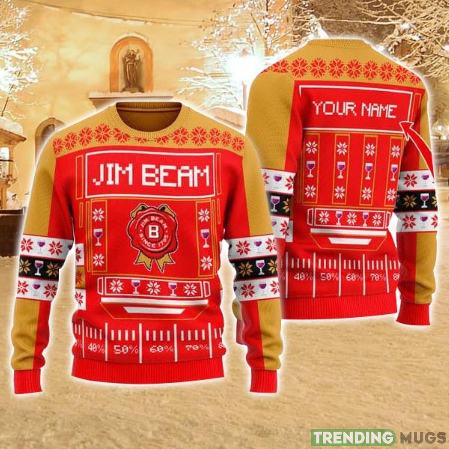 Featuring a charming snowy design and the iconic Jim Beam logo, this sweater is sure to make you the life of any holiday party. But what truly sets it apart is the option to personalize it with your name, making it a truly one-of-a-kind family gift.