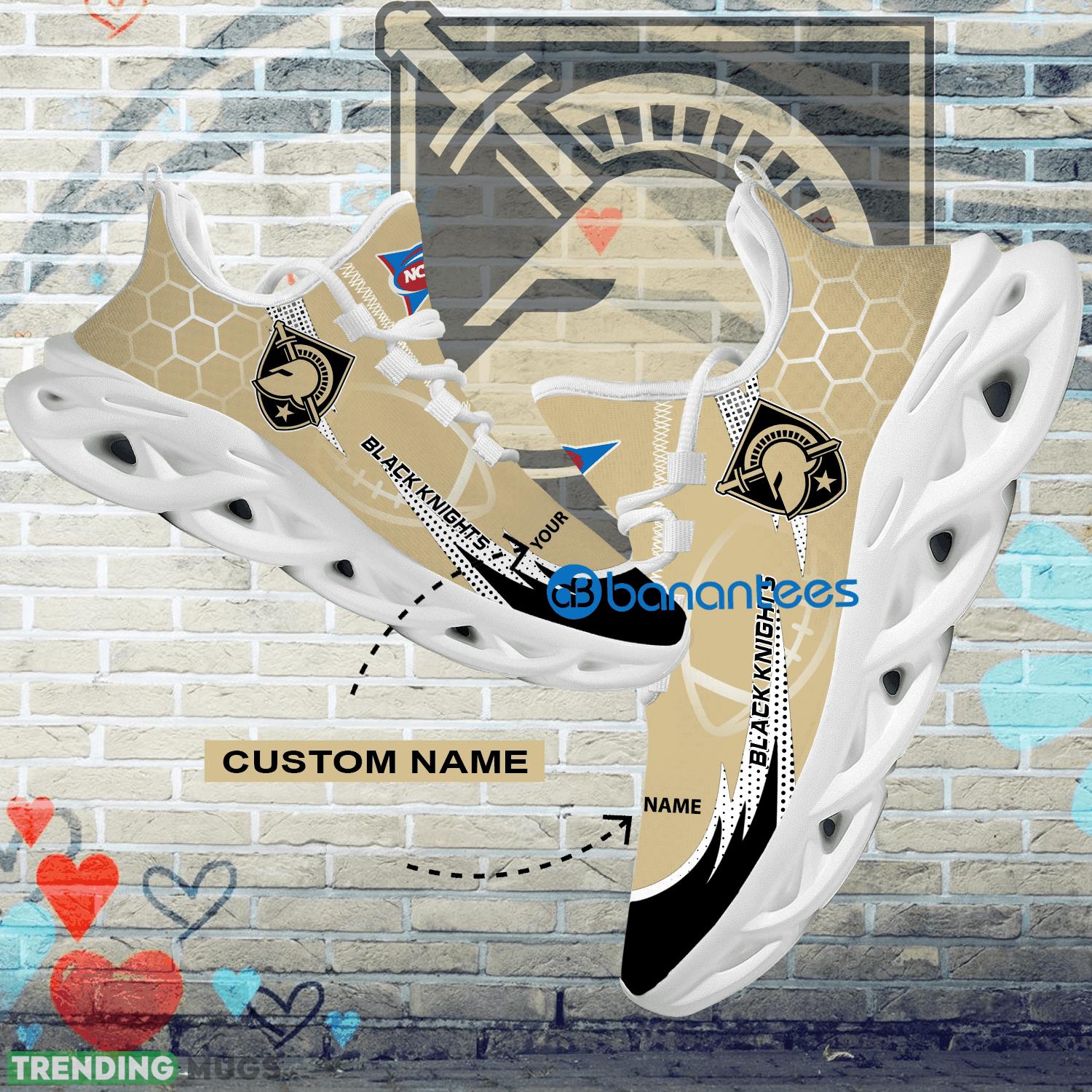 This Personalized NCAA Army West Point Black Knights Hexagonal Pattern Max Soul Shoes New Gift Sports Sneakers is a breathable, lightweight, and comfortable casual outdoor shoe that has a unique design. It is made of a mesh fabric which makes it sweat absorbent and breathable, while the rubber bottom ensures traction, comfort, and durability. It is available in two colors: black or white sole. There are two styles of shoelace holes so you can choose your preference.
