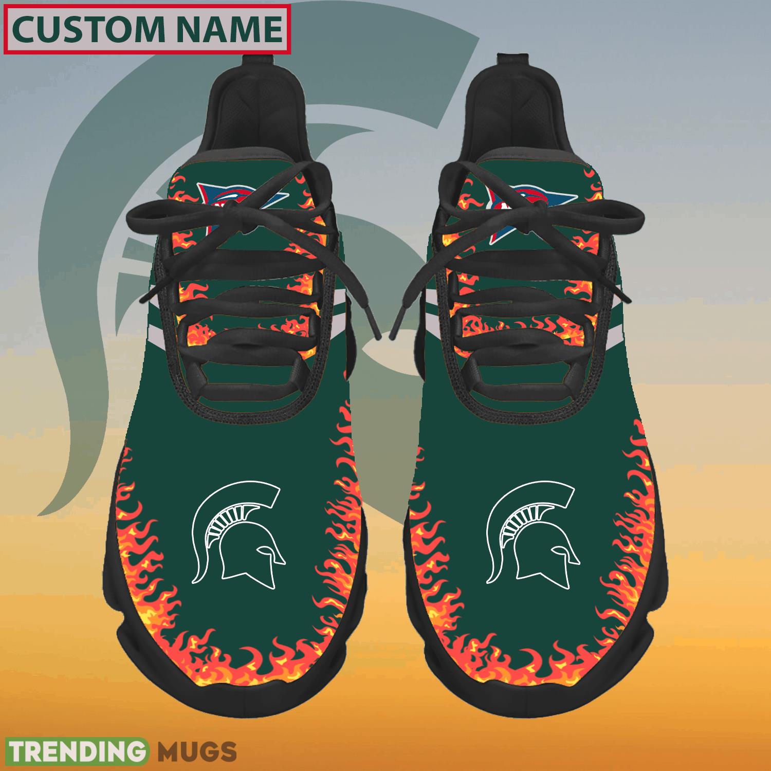 This Personalized NCAA Michigan State Spartans Logo New Style Max Soul Shoes For Men And Women is a breathable, lightweight, and comfortable casual outdoor shoe that has a unique design. It is made of a mesh fabric which makes it sweat absorbent and breathable, while the rubber bottom ensures traction, comfort, and durability. It is available in two colors: black or white sole. There are two styles of shoelace holes so you can choose your preference.