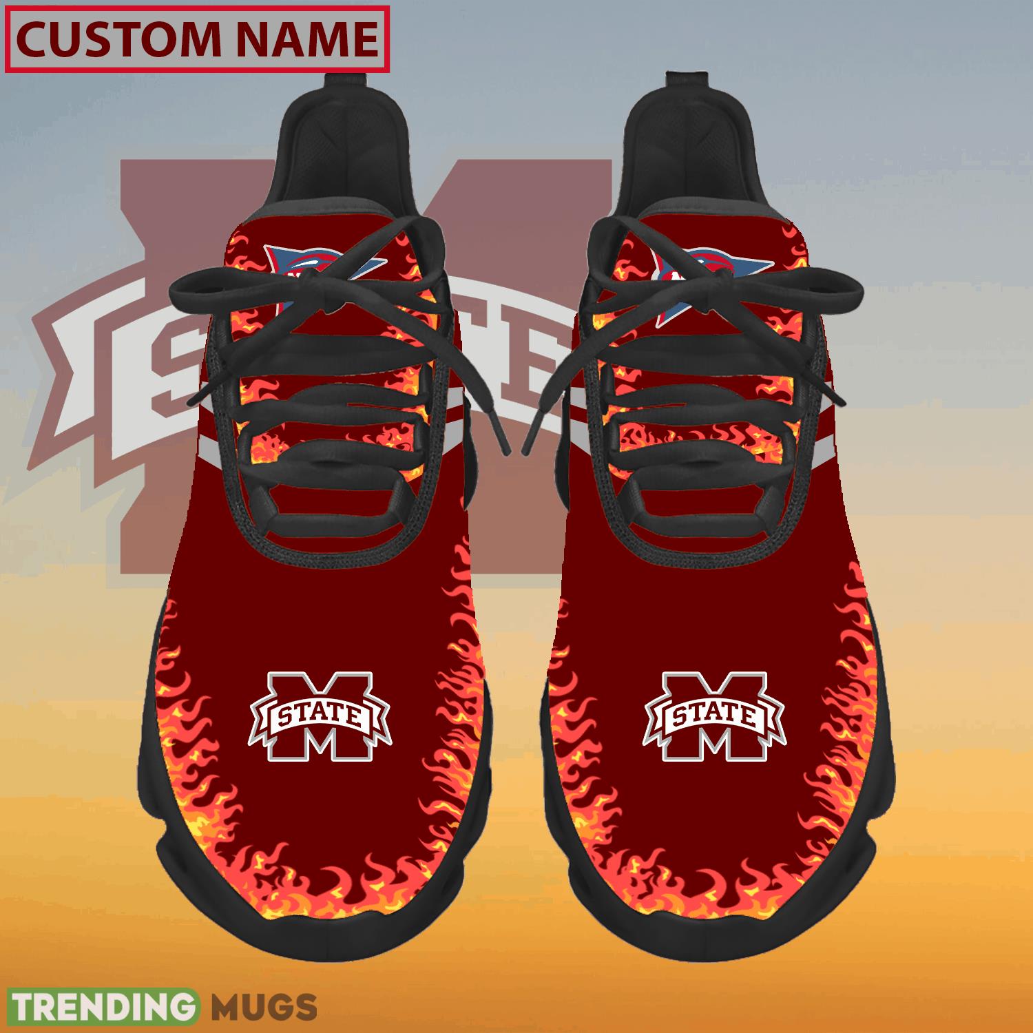 This Personalized NCAA Mississippi State Bulldogs Logo New Style Max Soul Shoes For Fans is a breathable, lightweight, and comfortable casual outdoor shoe that has a unique design. It is made of a mesh fabric which makes it sweat absorbent and breathable, while the rubber bottom ensures traction, comfort, and durability. It is available in two colors: black or white sole. There are two styles of shoelace holes so you can choose your preference.