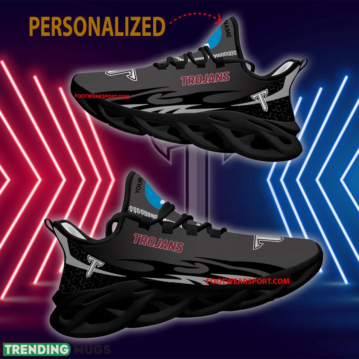 This Personalized NCAA Troy Trojans Max Soul Shoes New Design Symbol Chunky Sneaker is a breathable, lightweight, and comfortable casual outdoor shoe that has a unique design. It is made of a mesh fabric which makes it sweat absorbent and breathable, while the rubber bottom ensures traction, comfort, and durability. It is available in two colors: black or white sole. There are two styles of shoelace holes so you can choose your preference.