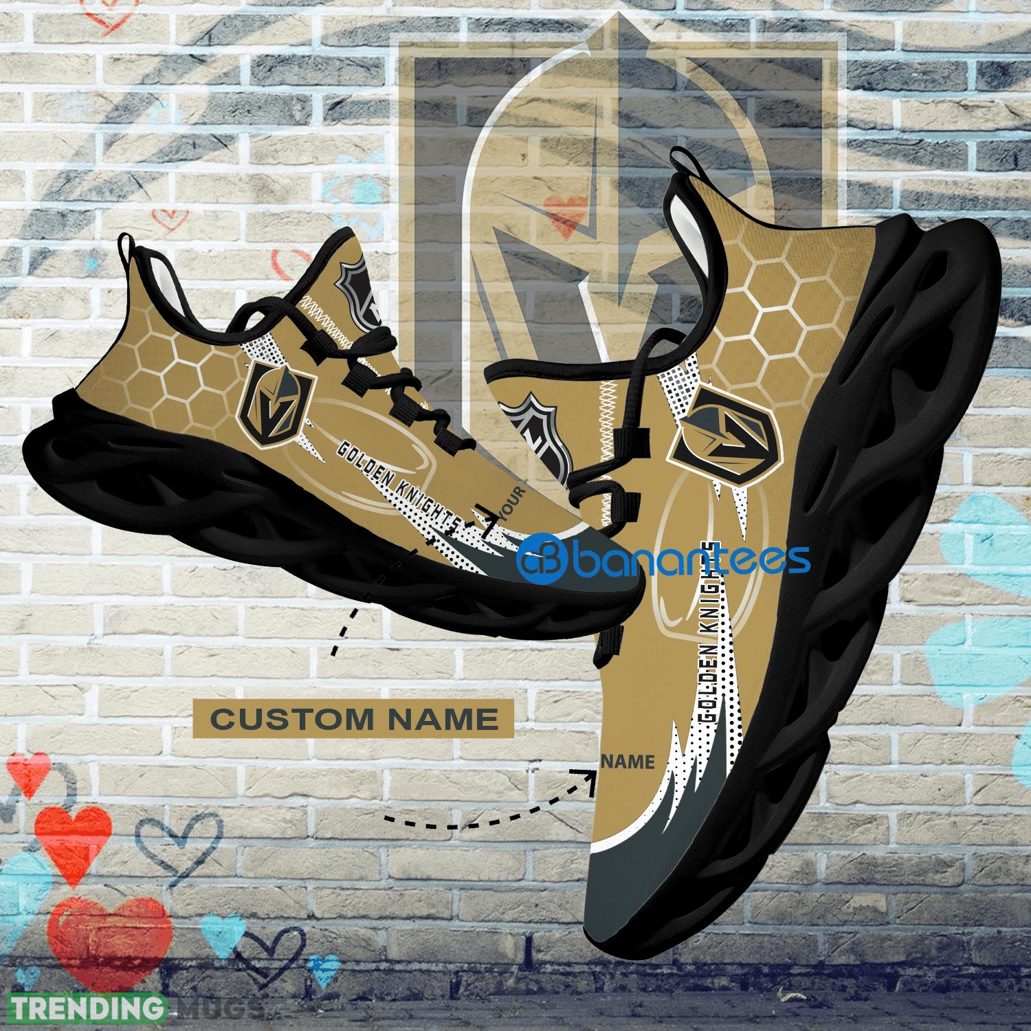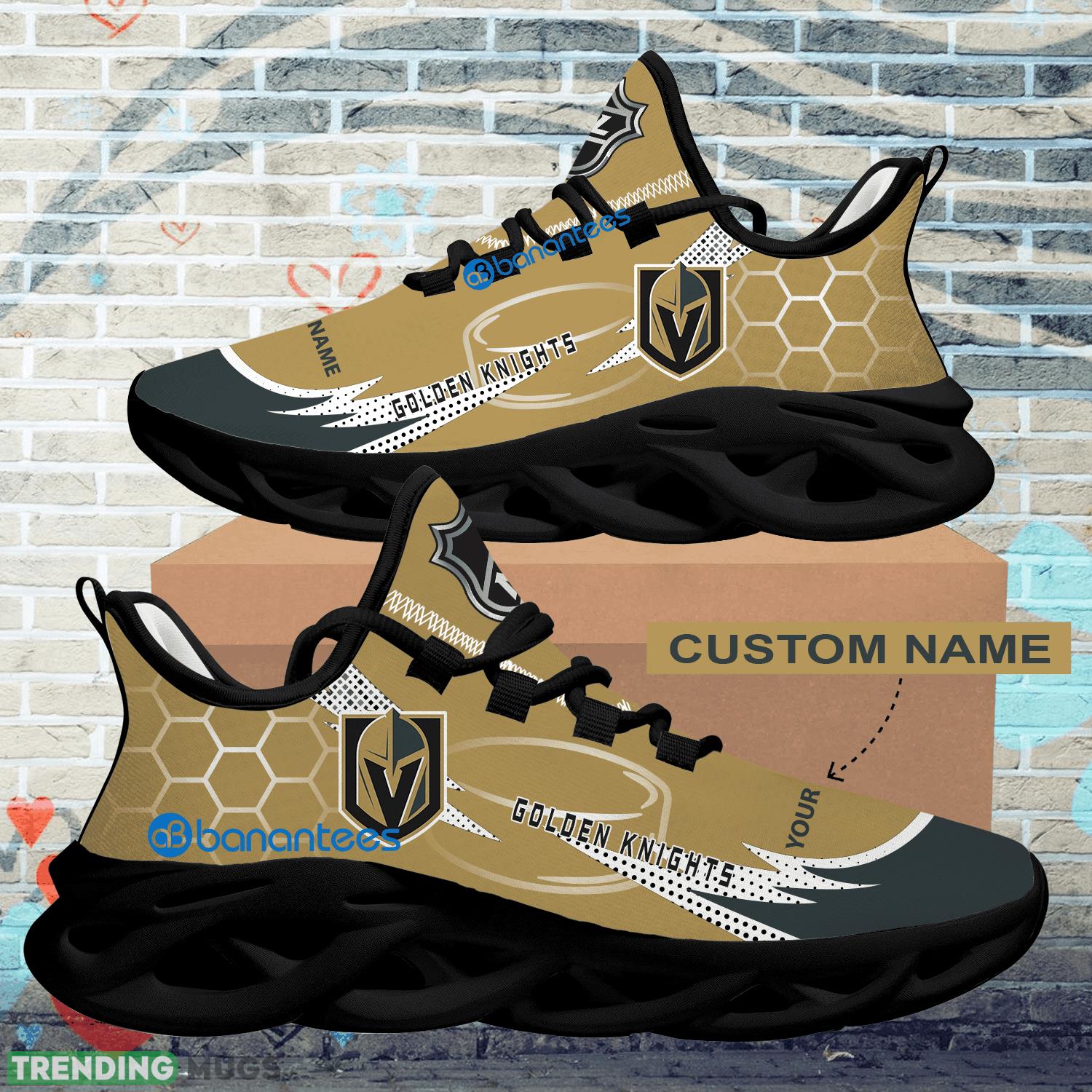 This Personalized NHL Vegas Golden Knights Hexagonal Pattern Max Soul Shoes New Gift Sports Sneakers is a breathable, lightweight, and comfortable casual outdoor shoe that has a unique design. It is made of a mesh fabric which makes it sweat absorbent and breathable, while the rubber bottom ensures traction, comfort, and durability. It is available in two colors: black or white sole. There are two styles of shoelace holes so you can choose your preference.