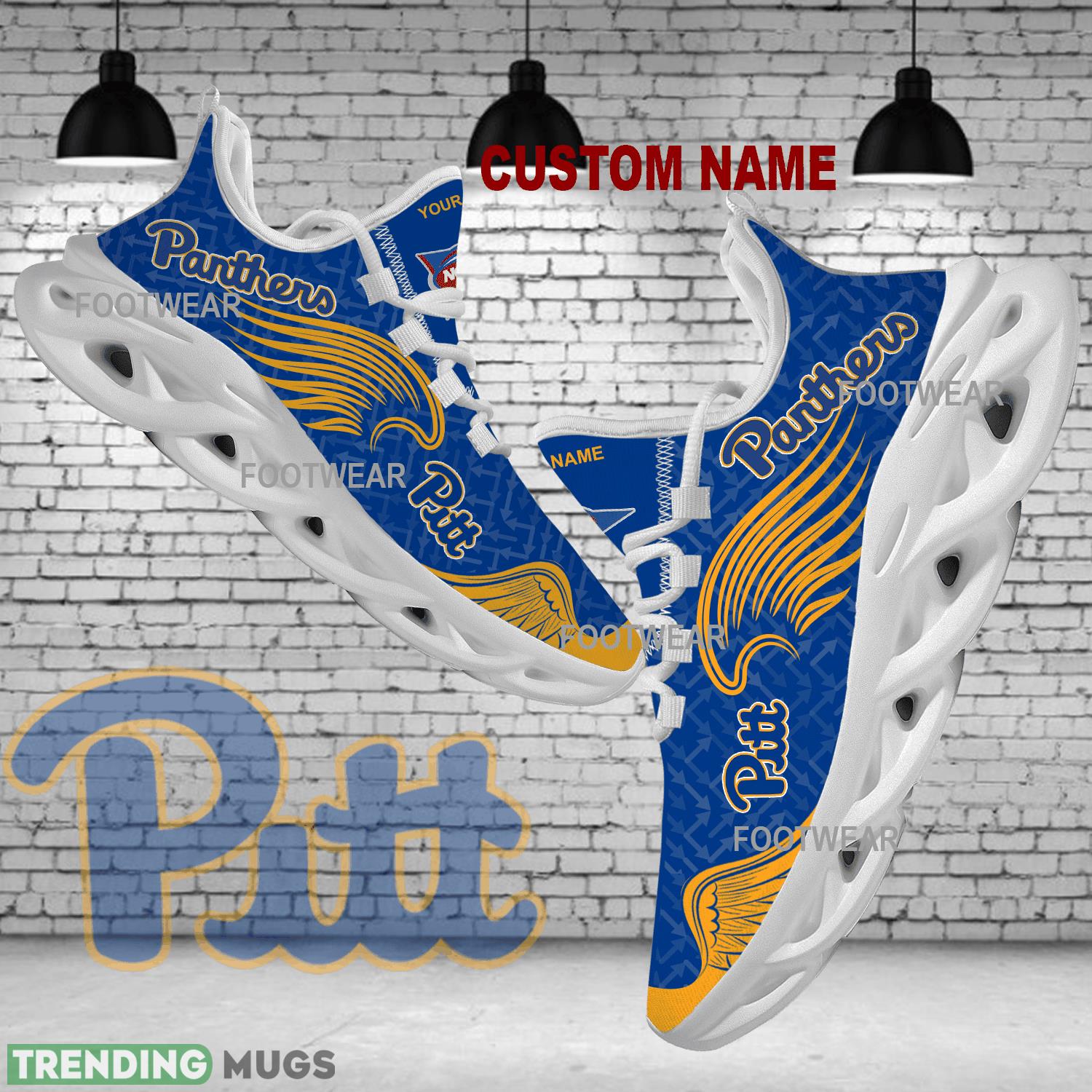 This Personalized Pittsburgh Panthers New Wings Arrow Pattern Max Soul Shoes Running Sneaker Energize is a breathable, lightweight, and comfortable casual outdoor shoe that has a unique design. It is made of a mesh fabric which makes it sweat absorbent and breathable, while the rubber bottom ensures traction, comfort, and durability. It is available in two colors: black or white sole. There are two styles of shoelace holes so you can choose your preference.