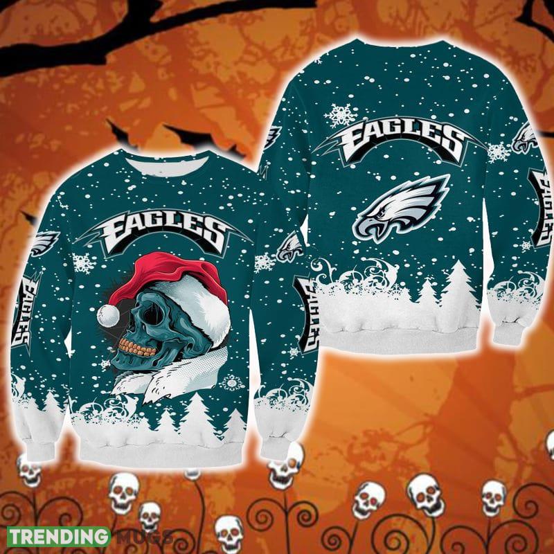 Designed for both men and women, this eye-catching sweater features a unique combination of the holiday season and Halloween vibes. The Philadelphia Eagles logo proudly stands out, beautifully integrated with festive Christmas elements, including snowflakes, Santa hats, and reindeer. But that’s not all – a touch of Halloween is added with the stylish skull design, creating a truly one-of-a-kind sweater that is sure to turn heads.