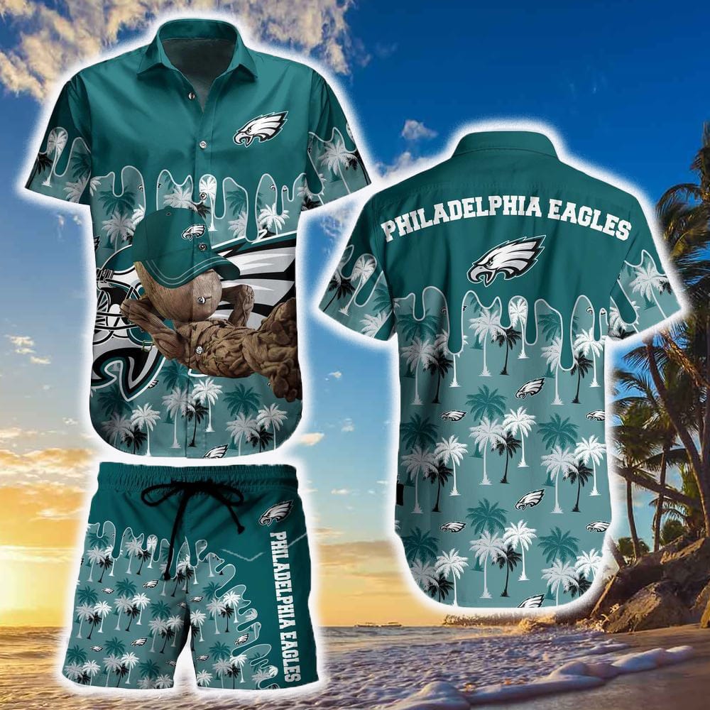 This design is available in a combo Hawaiian shirt & shorts. You can also get it separate. The default option is only one shirt or one pair of shorts. You have chosen a combo to get them both. This combo Philadelphia Eagles NFL Groot Graphic New Trends Hawaiian Shirt And Short For Men Women Gift Summer Beach Team Holiday is perfect to go to the beach. Get yours now or make a great gift.