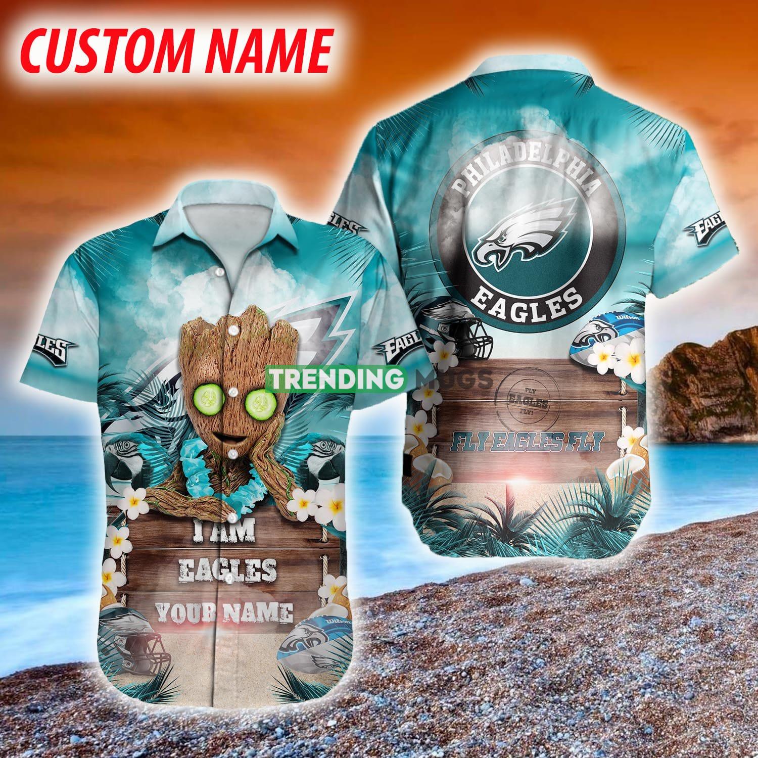 Featuring a vibrant and eye-catching design, this Hawaiian shirt is adorned with adorable Groot characters, adding a touch of humor to your outfit. The custom name option allows you to personalize it, making it an ideal gift for any Eagles fan in your life.