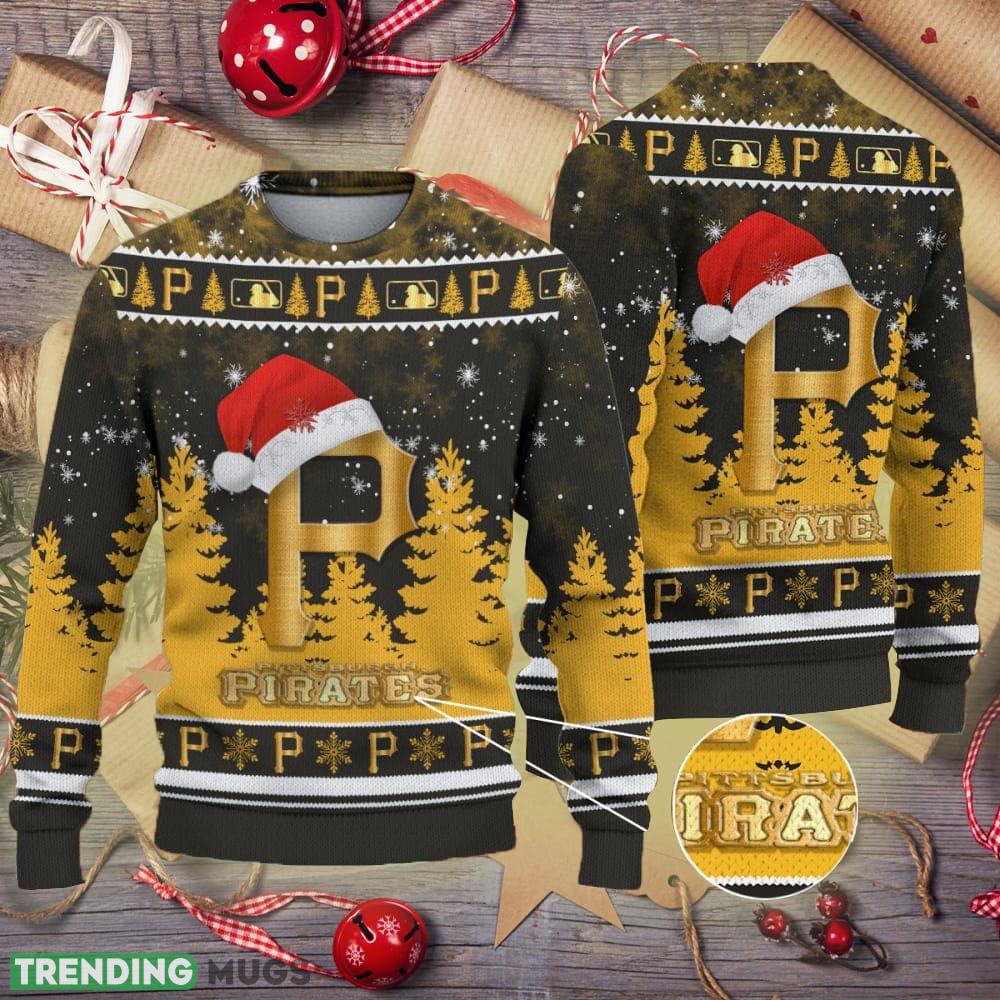 Pittsburgh Pirates Logo Golden Fans Santa Hat Tree Ugly Christmas Sweater AOP – Pittsburgh Pirates Logo Golden Fans Santa Hat Tree Ugly Christmas Sweater AOP
