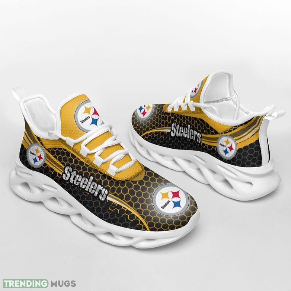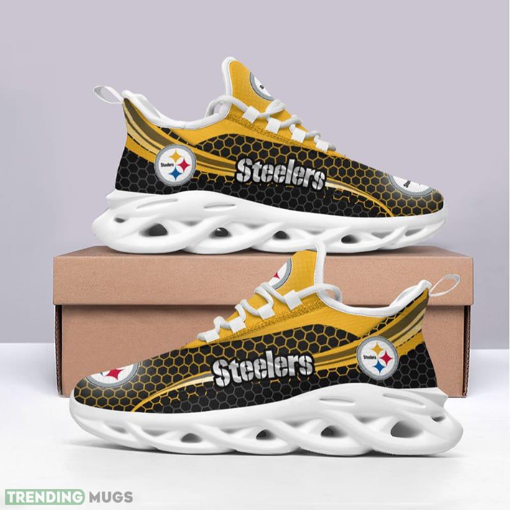 This Pittsburgh Steelers Honeycomb Pattern Max Soul Shoes Fashion Running Sports Sneakers is a breathable, lightweight, and comfortable casual outdoor shoe that has a unique design. It is made of a mesh fabric which makes it sweat absorbent and breathable, while the rubber bottom ensures traction, comfort, and durability. It is available in two colors: black or white sole. There are two styles of shoelace holes so you can choose your preference.