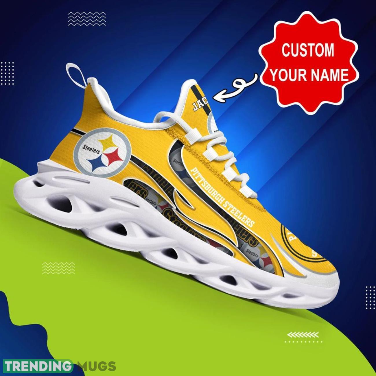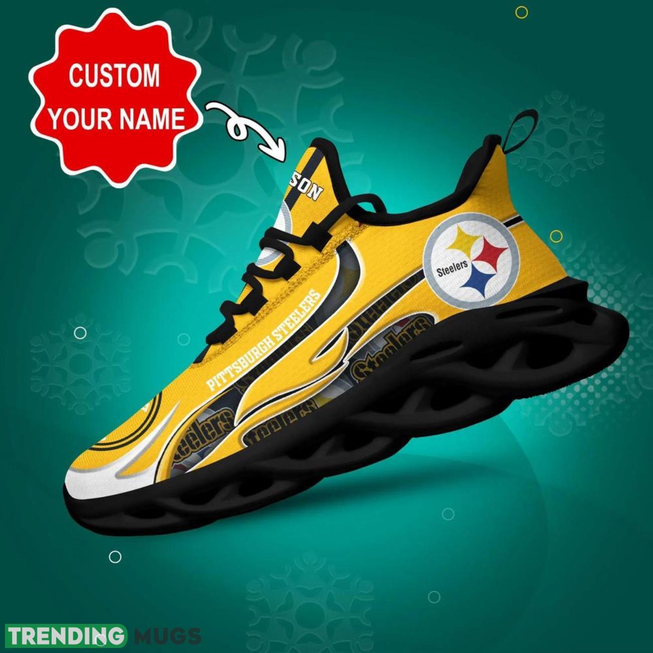 This Pittsburgh Steelers NFL Max Soul Shoes Custom Name Sneakers Personalized Shoes For NFL Big Fans is a breathable, lightweight, and comfortable casual outdoor shoe that has a unique design. It is made of a mesh fabric which makes it sweat absorbent and breathable, while the rubber bottom ensures traction, comfort, and durability. It is available in two colors: black or white sole. There are two styles of shoelace holes so you can choose your preference.