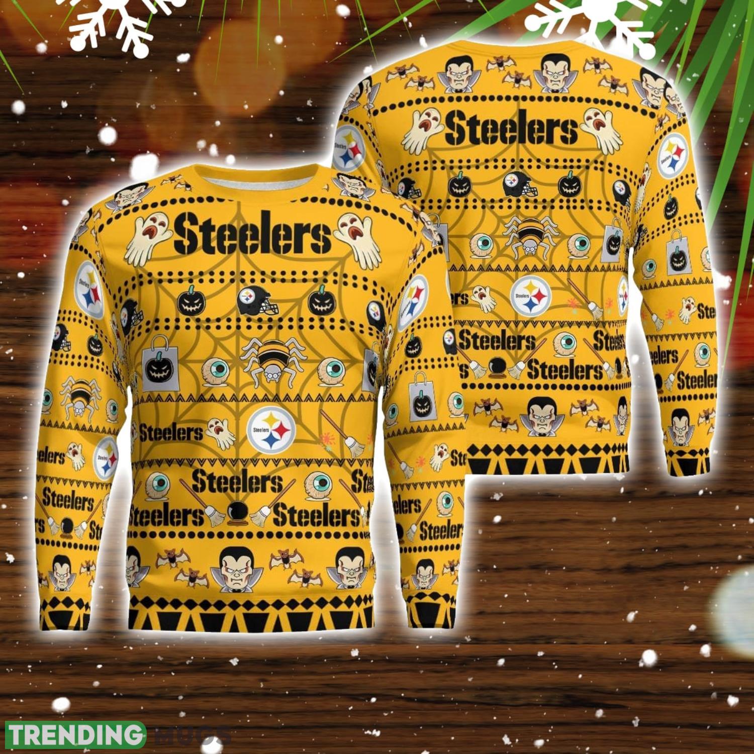 Get ready to show off your love for the Pittsburgh Steelers and get into the Halloween spirit with our Pittsburgh Steelers Pumpkin Halloween Spooky Ghost Pattern Funny 3D Sweater! This eye-catching sweater is the perfect blend of fashion and fandom, making it an ideal gift for both men and women.