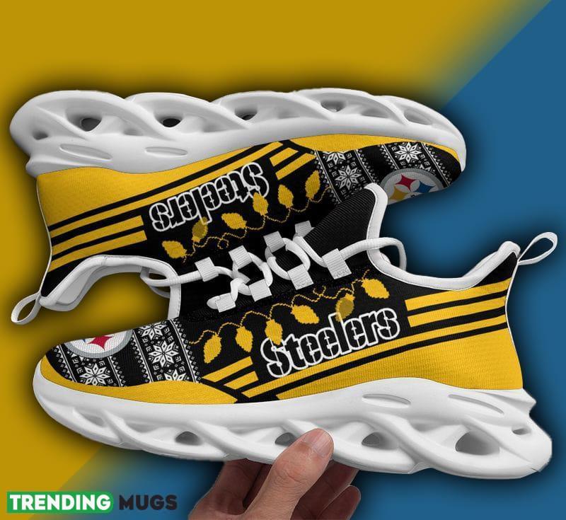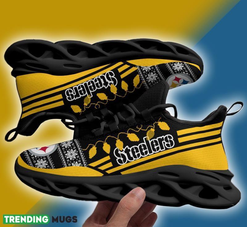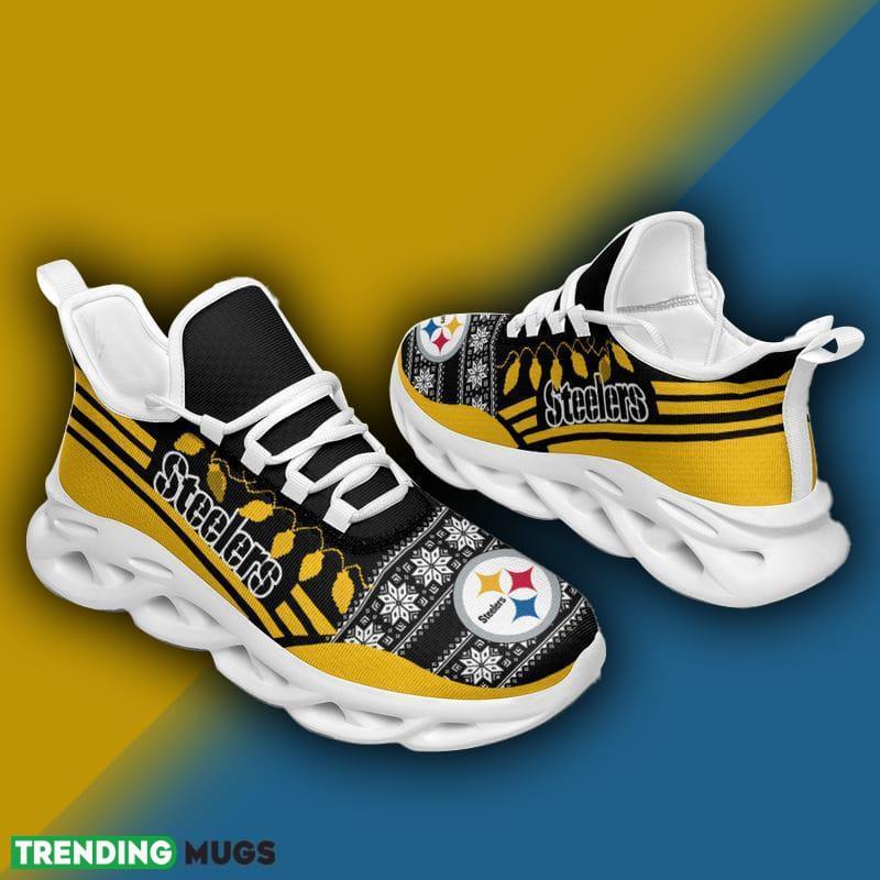 This Pittsburgh Steelers X-max Santa Claus Max Soul Shoes Icon Christmas Sneakers is a breathable, lightweight, and comfortable casual outdoor shoe that has a unique design. It is made of a mesh fabric which makes it sweat absorbent and breathable, while the rubber bottom ensures traction, comfort, and durability. It is available in two colors: black or white sole. There are two styles of shoelace holes so you can choose your preference.