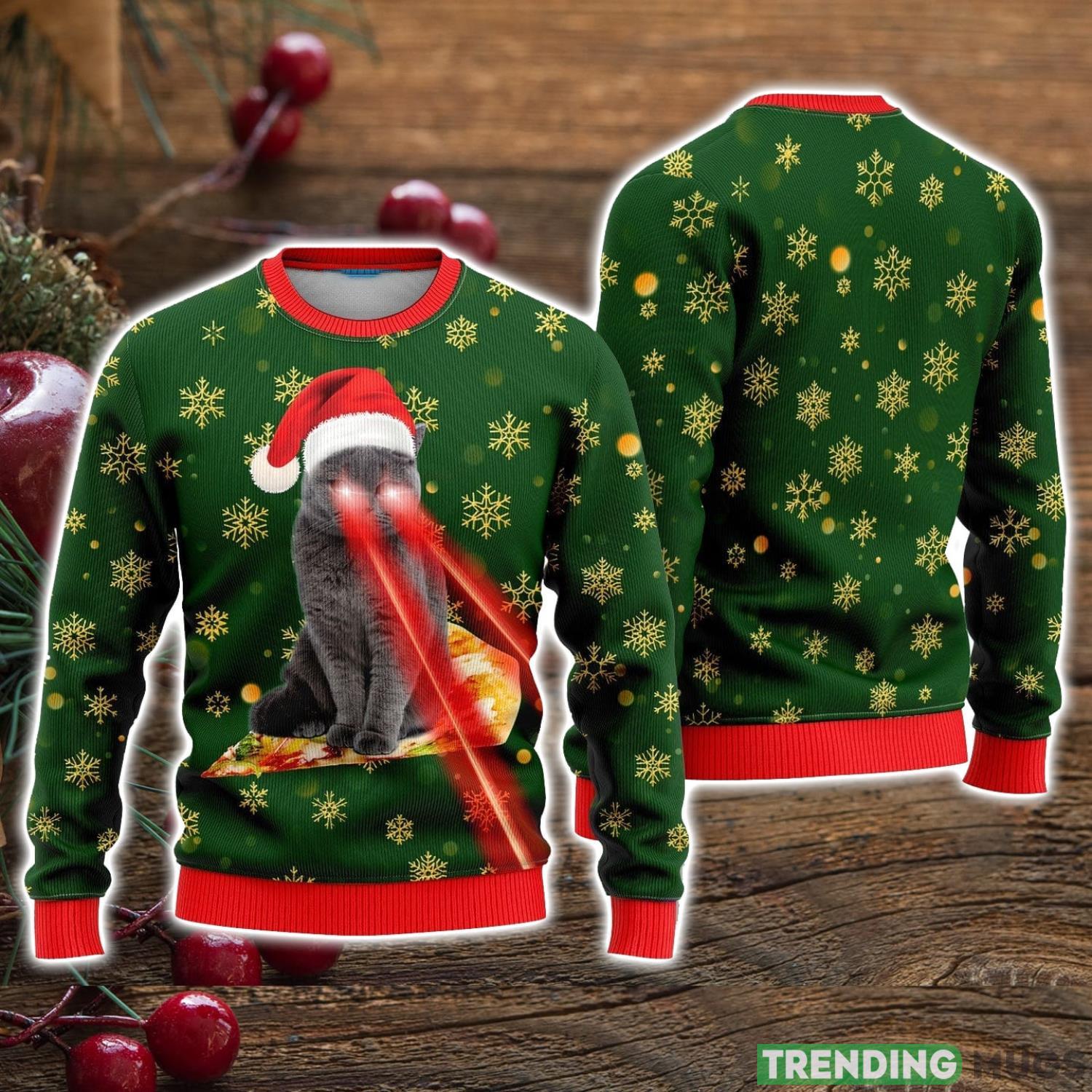Pizza Cat With Laser Eyes snowflake pattern Ugly Christmas Sweater Christmas Holiday Gift For Men And Women Informations: