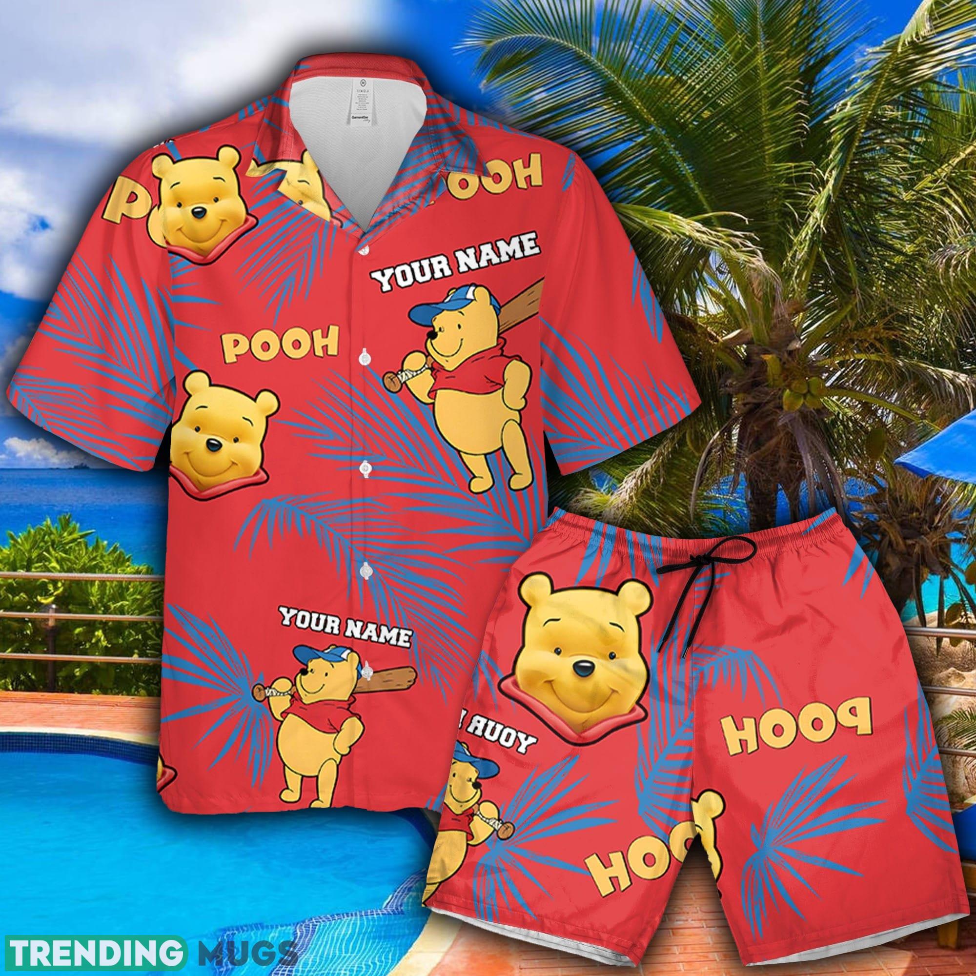 Pooh Baseball Red Yellow Hawaiian Shirt And Short Palm Leaves Custom Name Summer Gift For Men And Women Details: