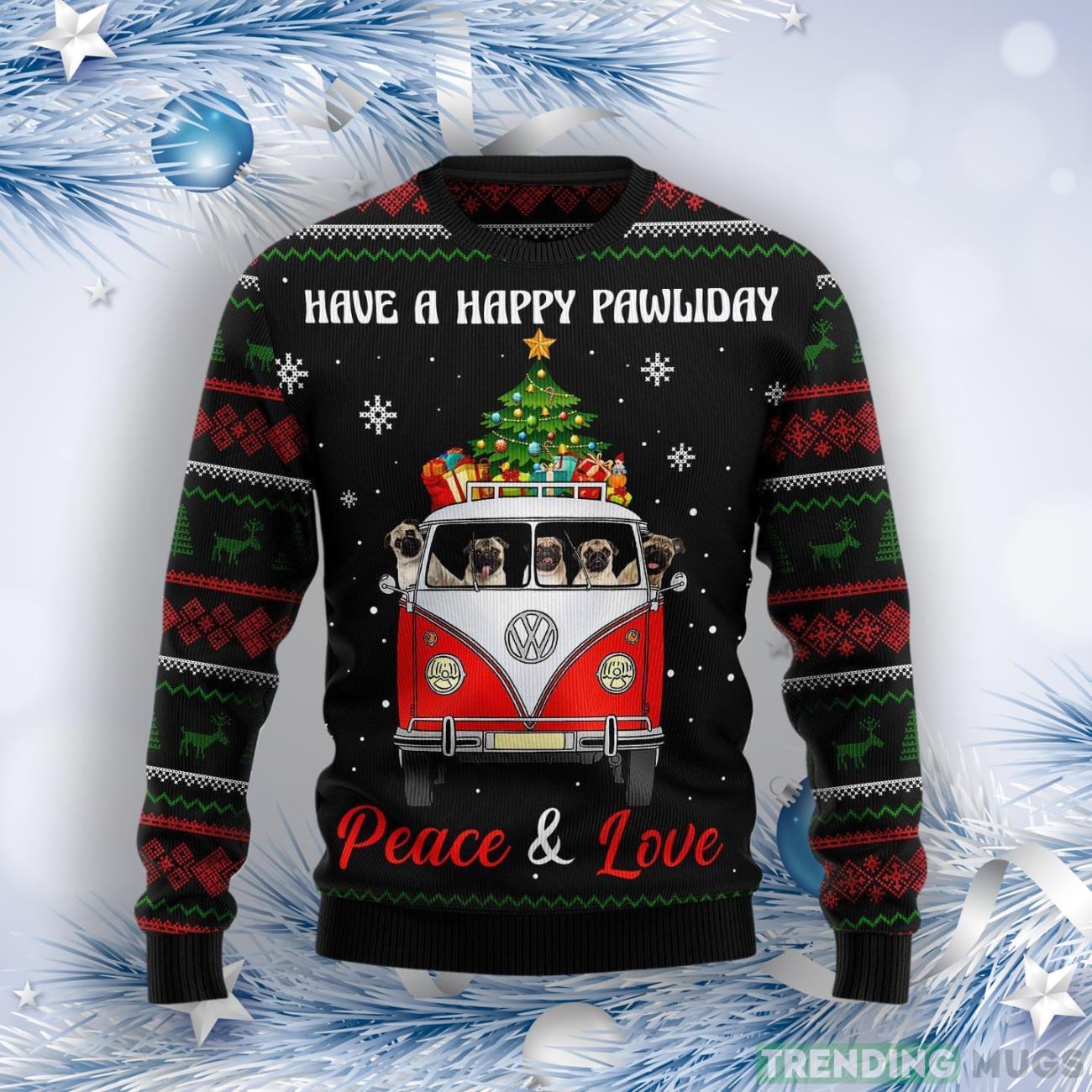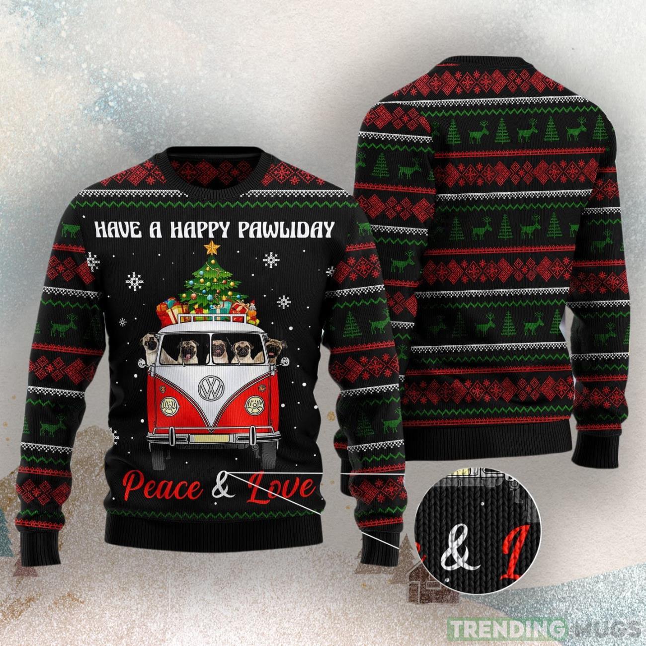 Pug Dogs Carrying Gift Christmas On The Red Car Ugly Christmas Sweater Informations: