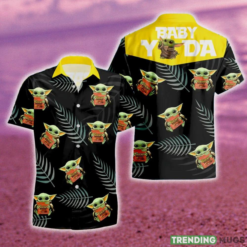 Crafted with the utmost attention to detail, our Hawaiian shirt features a vibrant and eye-catching print that showcases the adorable Baby Yoda character embracing a delectable Reese’s peanut butter cup. The intricate design perfectly captures the playful spirit of both the Star Wars universe and the beloved Reese’s brand.