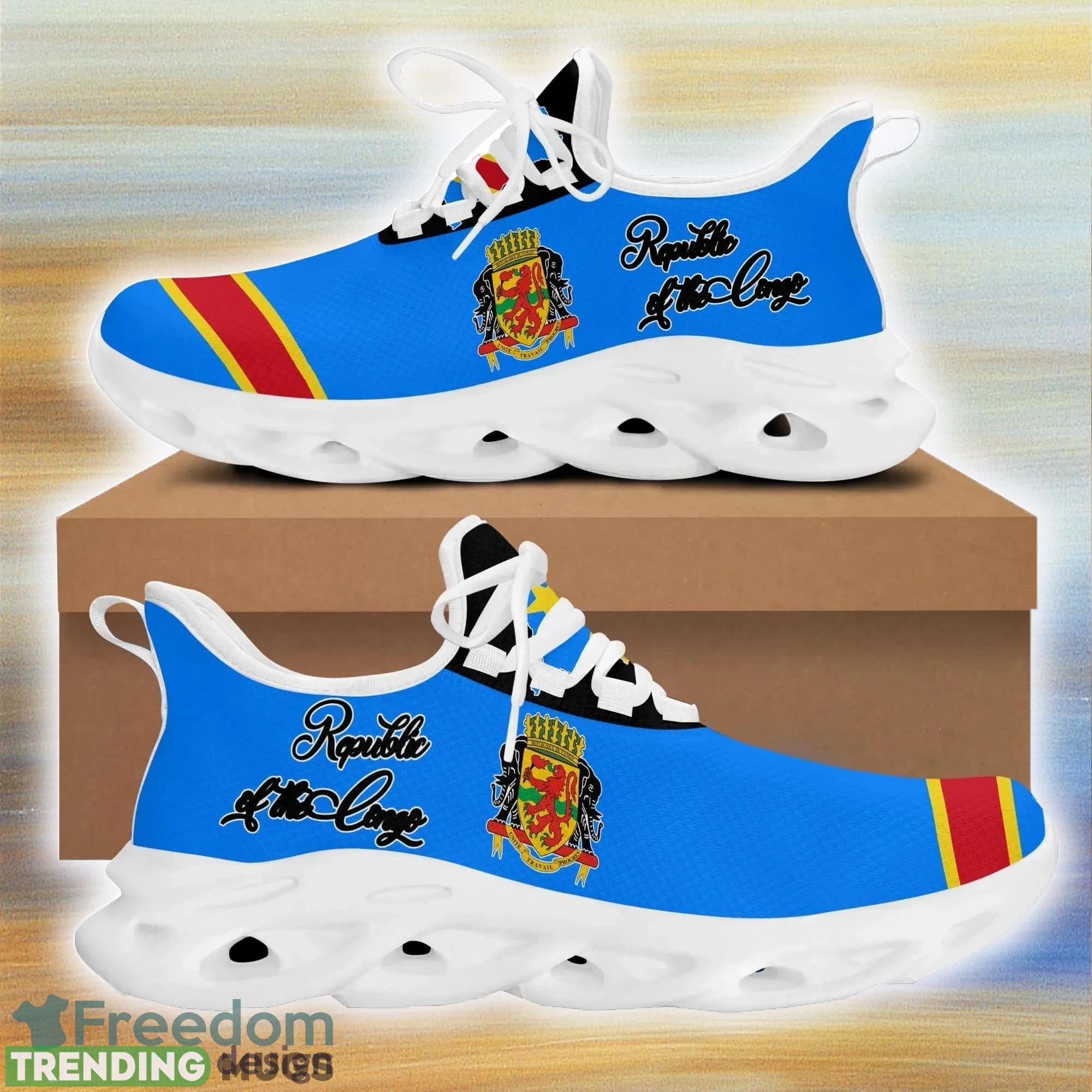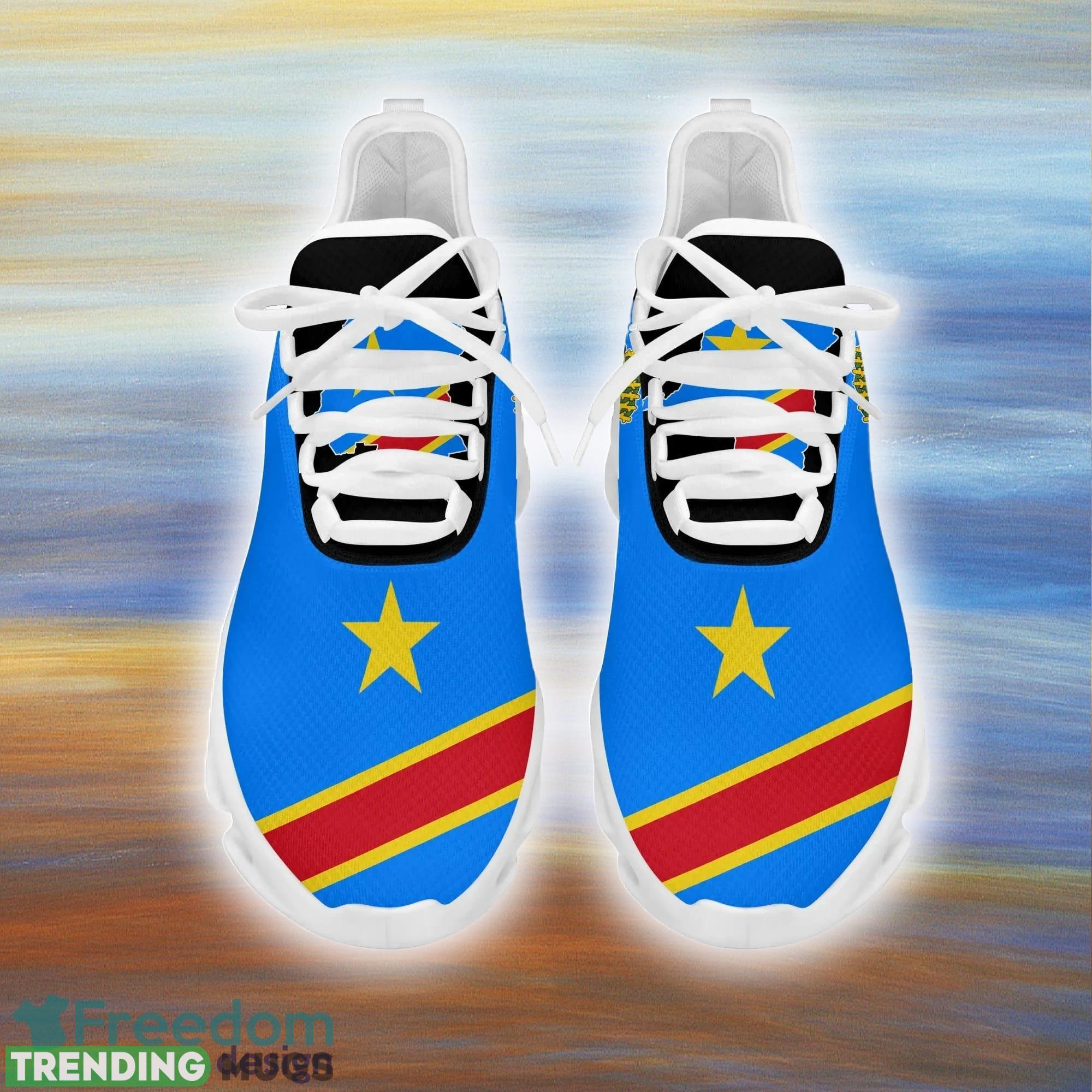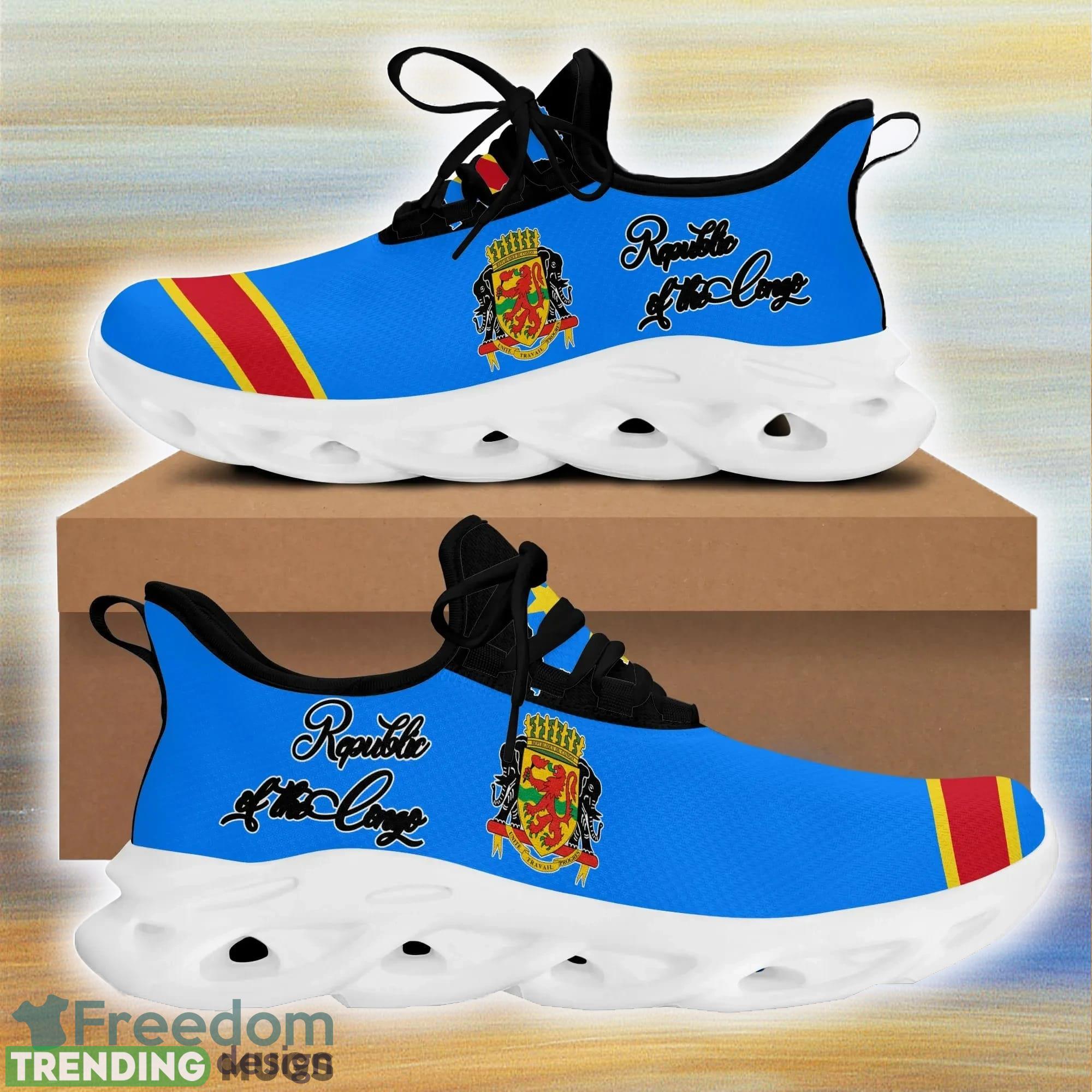 This Republic of the Congo Clunky Max Soul Shoes For Men And Women Sports Unisex Sneakers is a breathable, lightweight, and comfortable casual outdoor shoe that has a unique design. It is made of a mesh fabric which makes it sweat absorbent and breathable, while the rubber bottom ensures traction, comfort, and durability. It is available in two colors: black or white sole. There are two styles of shoelace holes so you can choose your preference.