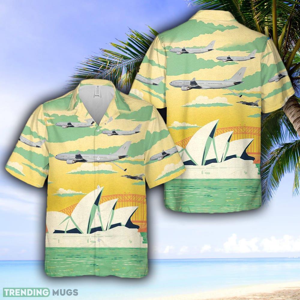 Featuring a vibrant print of the Royal Australian Air Force KC-30 A39-002 extending its fuel boom to refuel a USAF F-16, this Hawaiian shirt is a true homage to the heroes of the sky. The striking colors and intricate illustration showcase the power and precision of these remarkable aircraft in action.