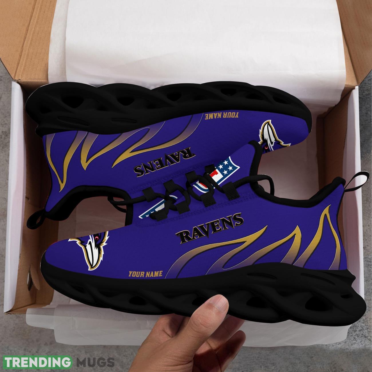 This Running Sneakers NFL Baltimore Ravens Fire Pattern Personalized Name Max Soul Shoes Sneakers is a breathable, lightweight, and comfortable casual outdoor shoe that has a unique design. It is made of a mesh fabric which makes it sweat absorbent and breathable, while the rubber bottom ensures traction, comfort, and durability. It is available in two colors: black or white sole. There are two styles of shoelace holes so you can choose your preference.