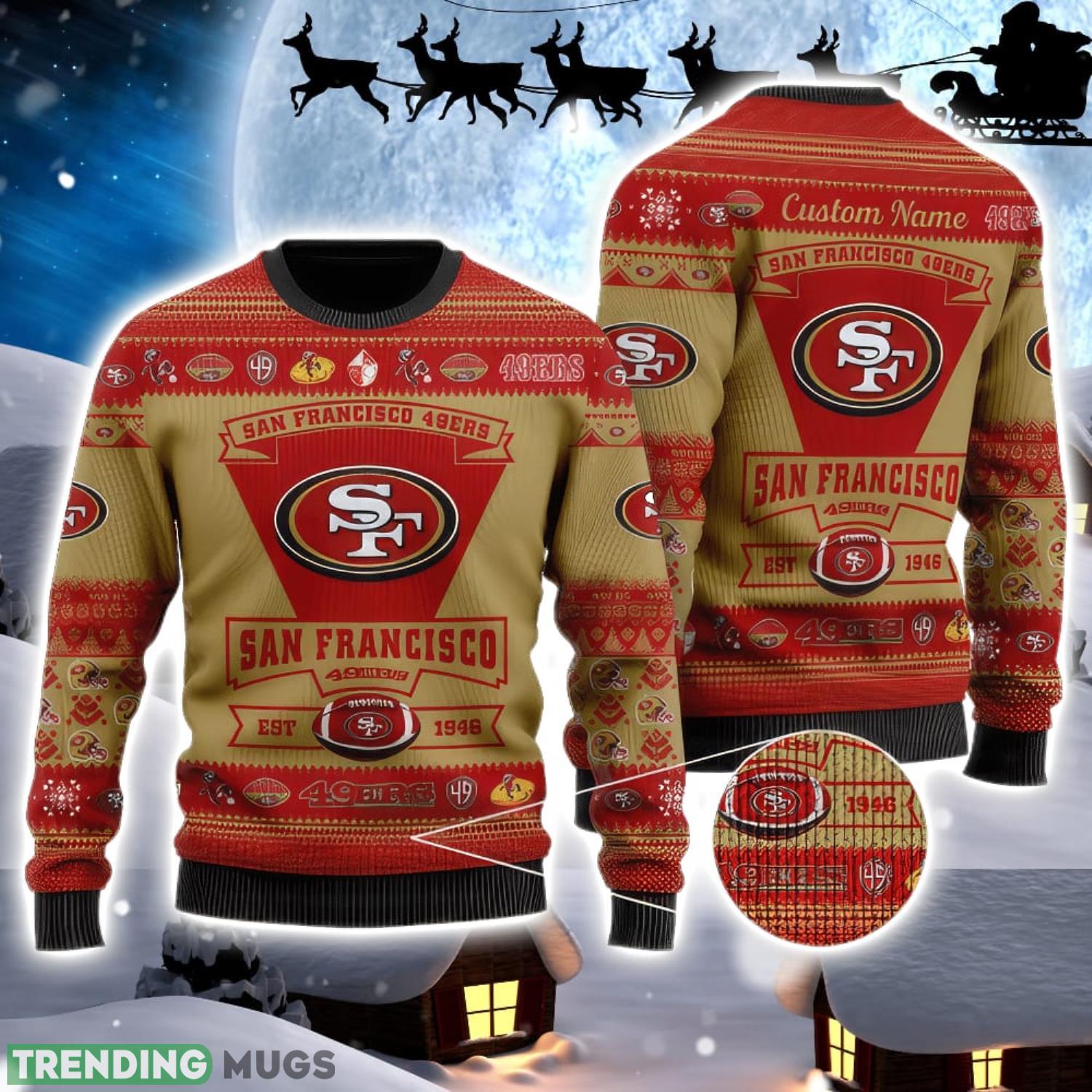 Crafted with utmost attention to detail, our San Francisco 49ers Team Custom Name Ugly Christmas Sweater features a vibrant and eye-catching design that proudly displays the iconic 49ers logo. The sweater is adorned with intricate patterns and festive colors, guaranteeing you’ll stand out from the crowd at any holiday gathering.