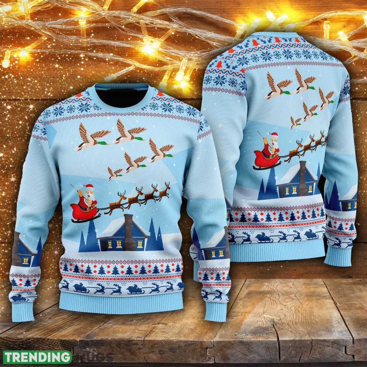 Featuring a whimsical design of Santa Claus on a duck hunting adventure, this sweater is sure to make heads turn and hearts jingle. The vibrant colors and intricate detailing bring this Christmas-themed sweater to life, making it a must-have for any festive gathering or casual holiday outing.