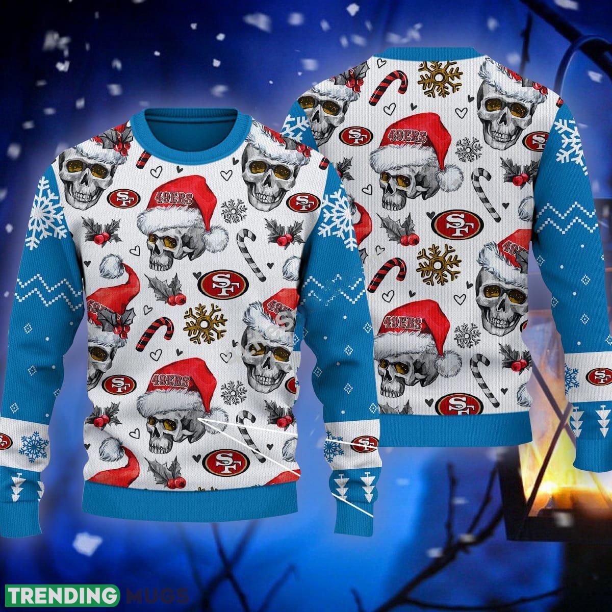 Get ready to sleigh in style this holiday season with our Santa Skull San Francisco 49ers Candy Cane Ugly Sweater! Designed with a perfect blend of festive cheer and team spirit, this eye-catching blue sweater is the ultimate gift for Christmas.