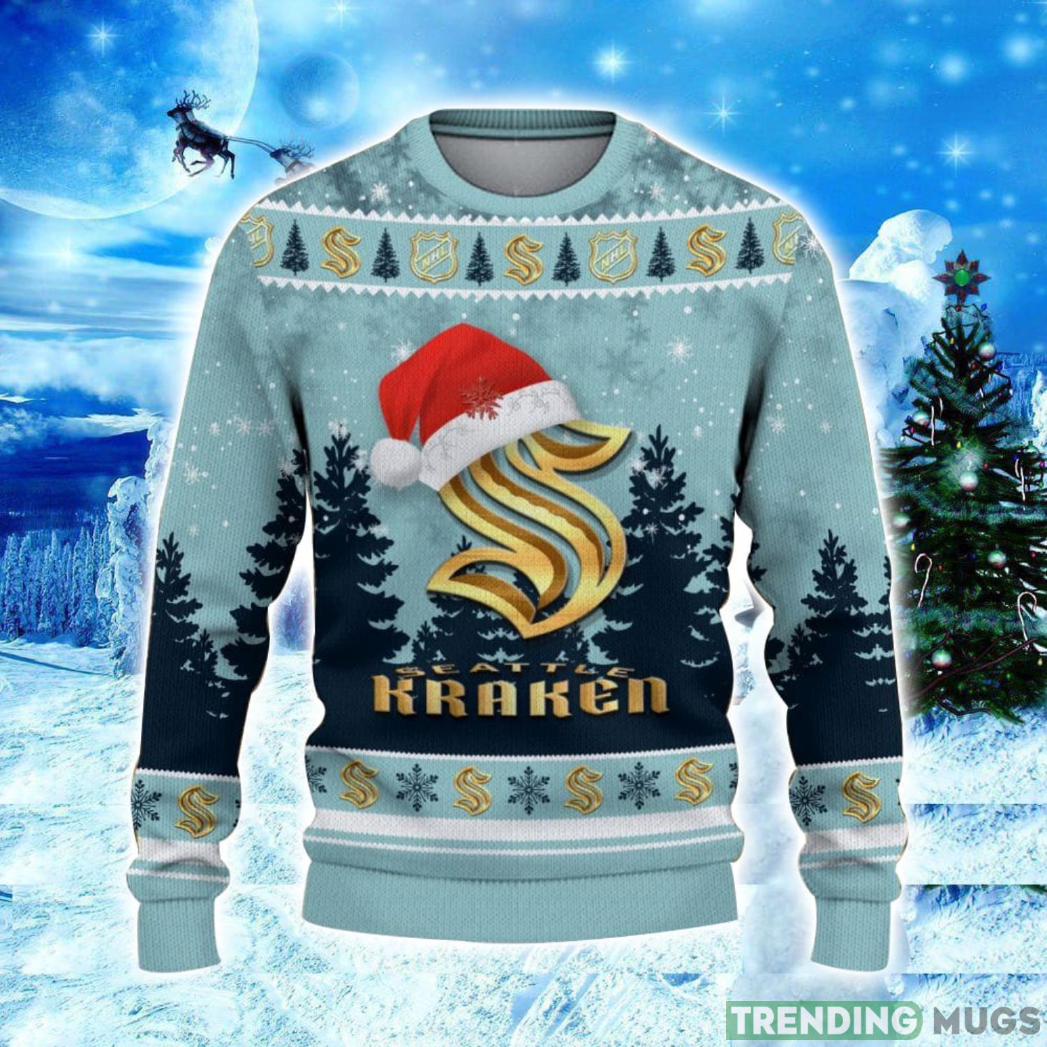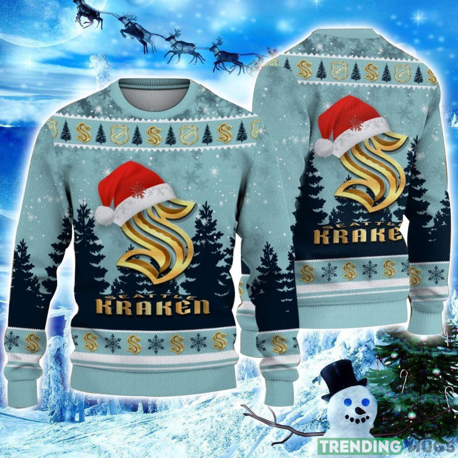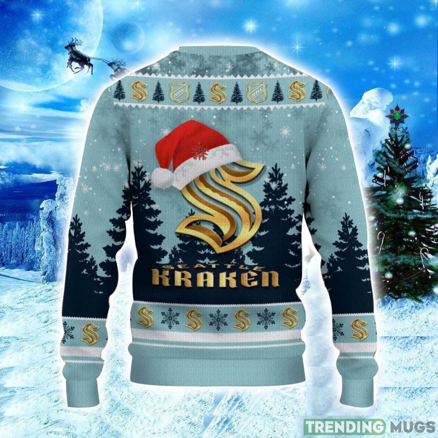 Get ready to spread some holiday cheer with our Seattle Kraken Logo Wearing Santa Hat Christmas Gift Ugly Christmas Sweater! This festive sweater is the perfect addition to your holiday wardrobe and a great gift idea for any Seattle Kraken fan.
