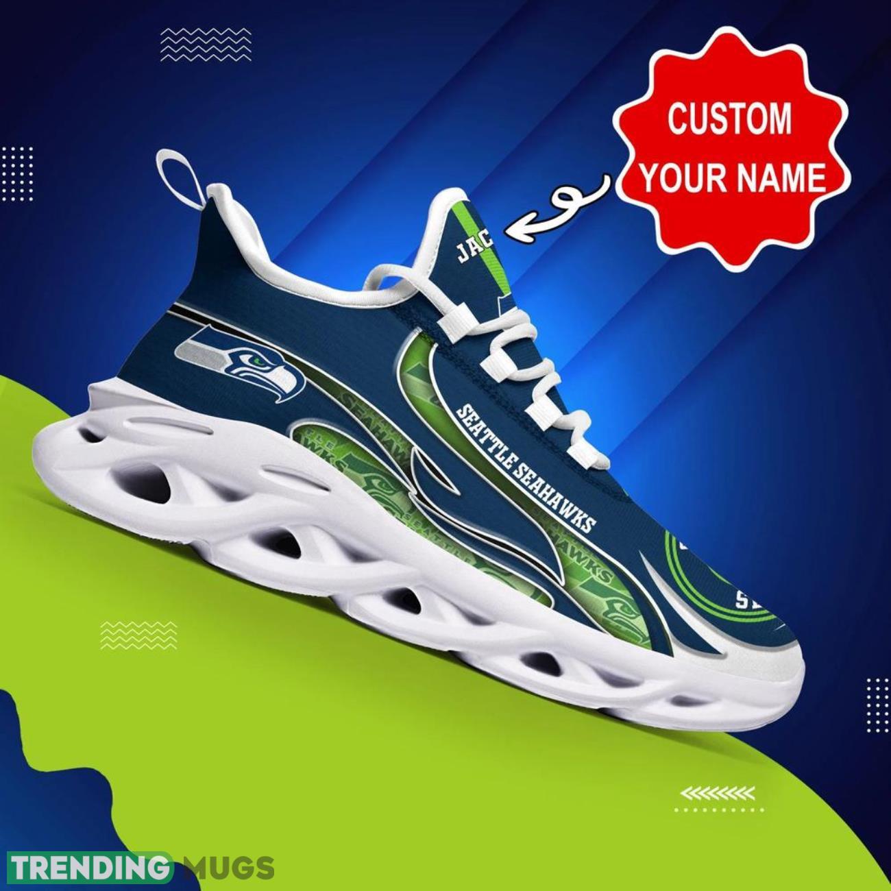 This Seattle Seahawks NFL Logo Sport Team Max Soul Shoes Custom Name Personalized Name Gifts Big Fans Sport Shoes is a breathable, lightweight, and comfortable casual outdoor shoe that has a unique design. It is made of a mesh fabric which makes it sweat absorbent and breathable, while the rubber bottom ensures traction, comfort, and durability. It is available in two colors: black or white sole. There are two styles of shoelace holes so you can choose your preference.