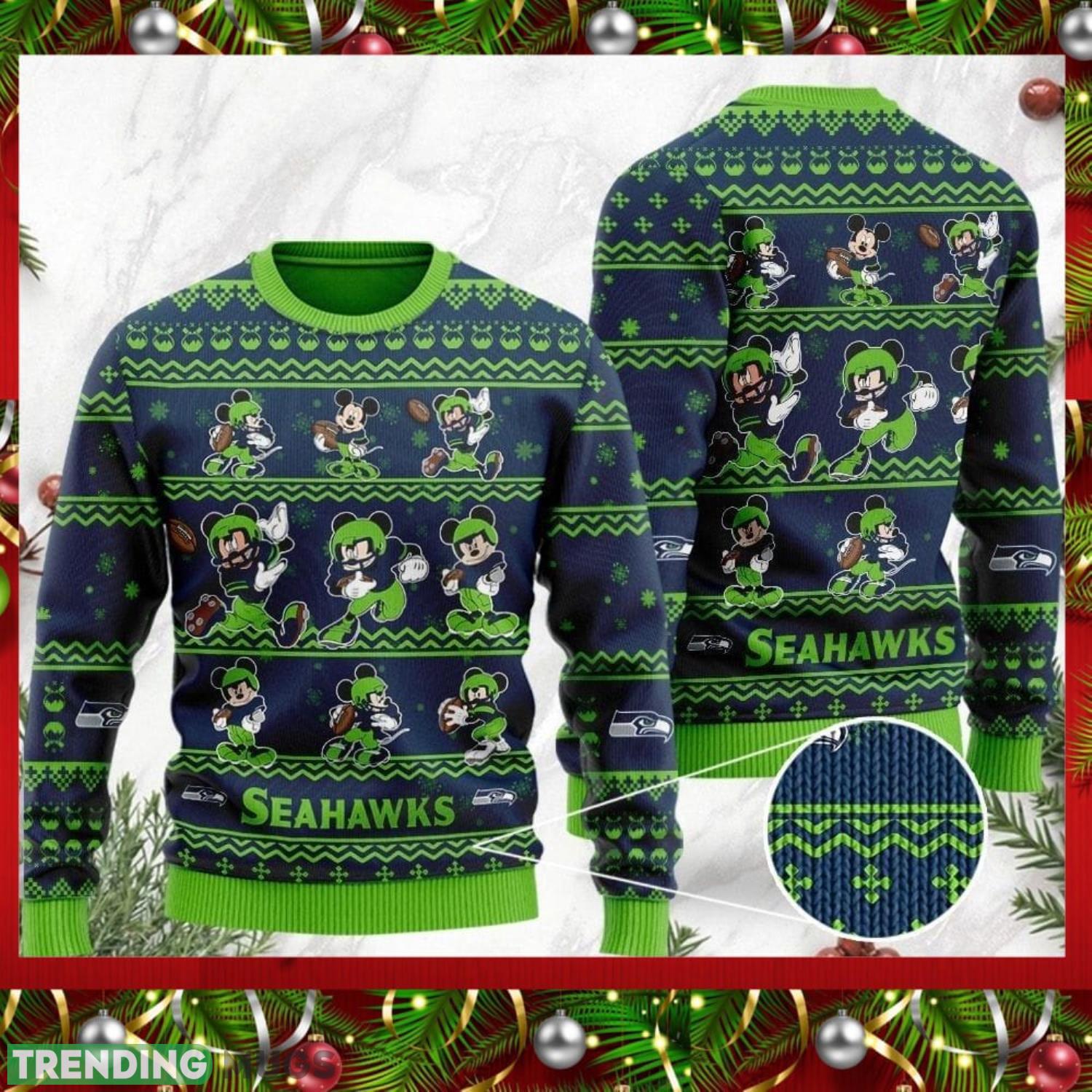 Crafted with the utmost care, this sweater features a thicken fabric that will keep you cozy and warm throughout the winter season. The all-over print showcases a delightful mix of Mickey Mouse and Christmas elements, including snowflakes, Santa hats, and of course, the iconic Seattle Seahawks logo. It’s a unique design that effortlessly blends your favorite football team with the magic of the holiday season.