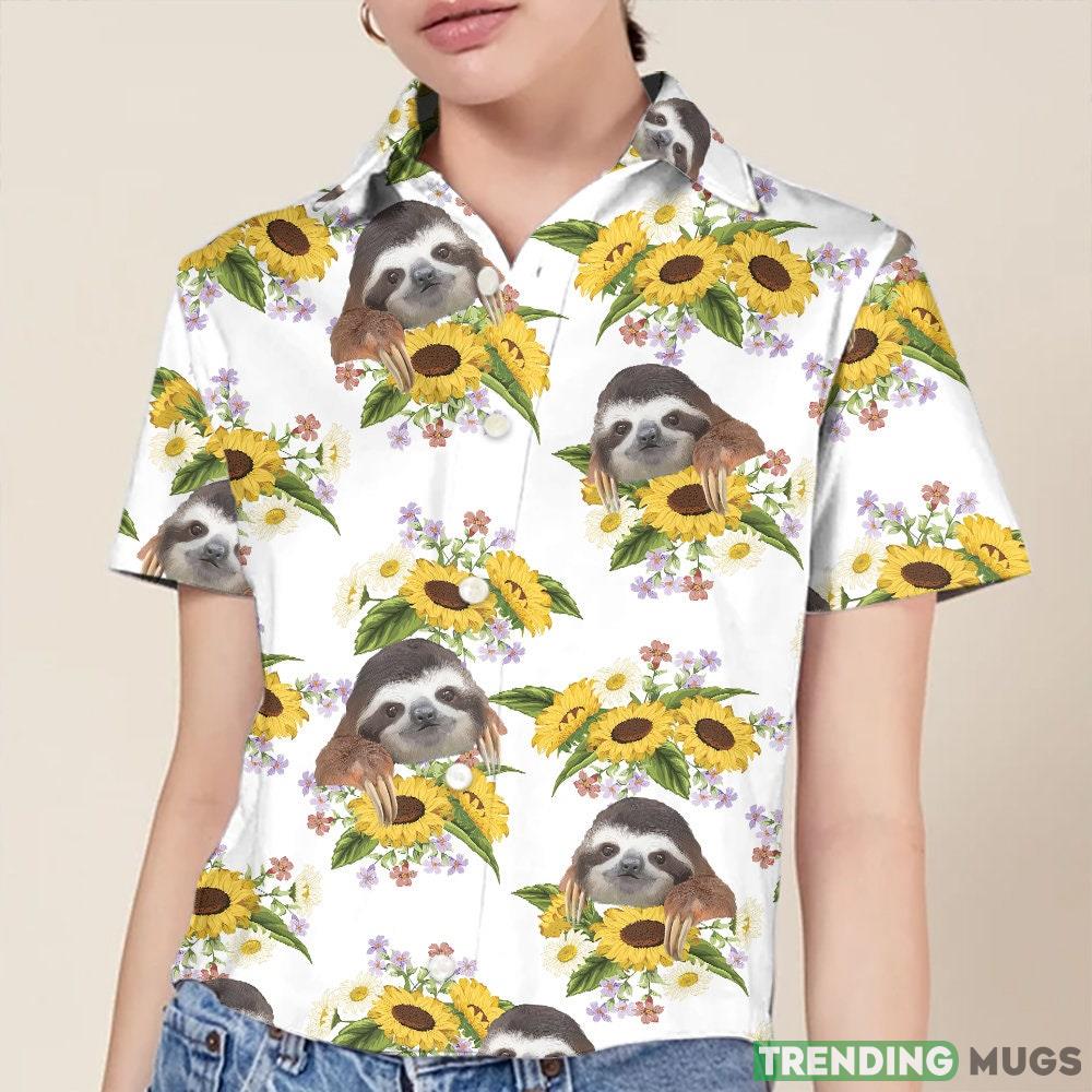 Featuring a delightful print of adorable sloths surrounded by blooming sunflowers, this shirt is a unique and eye-catching addition to your summer wardrobe. The vibrant colors and intricate details make it a true work of art that will surely turn heads wherever you go.
