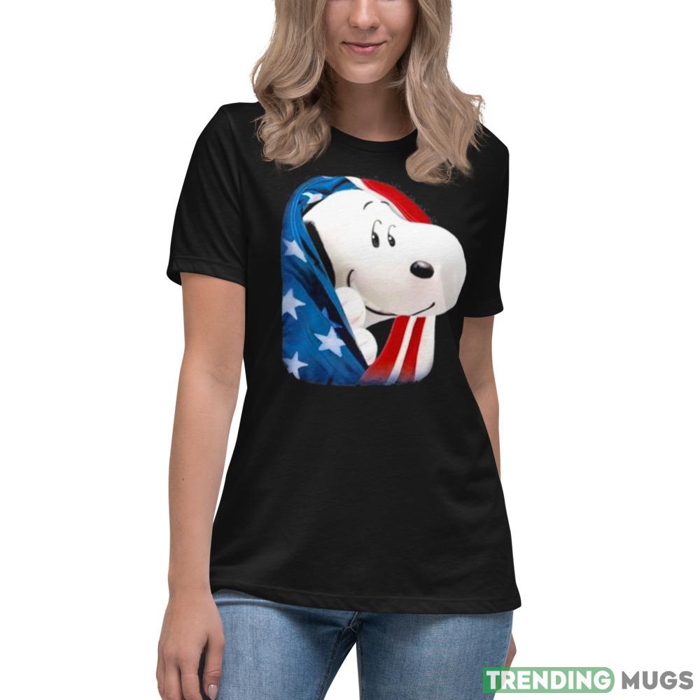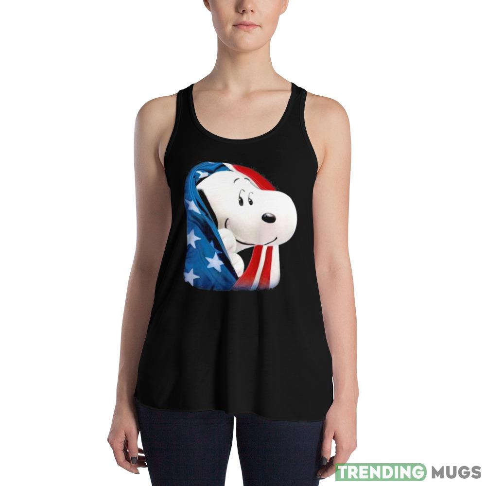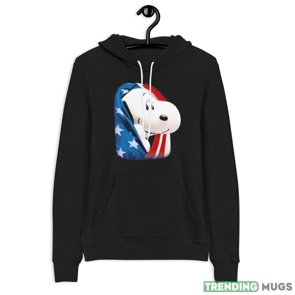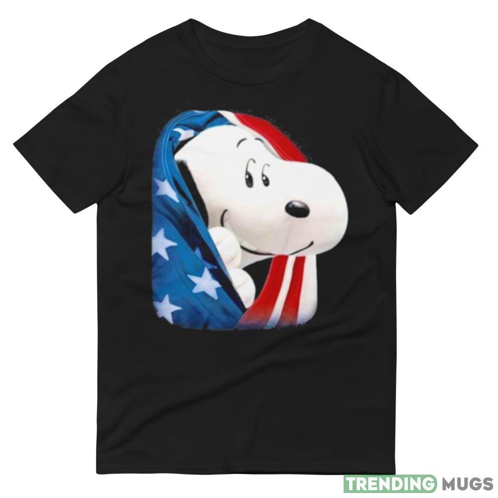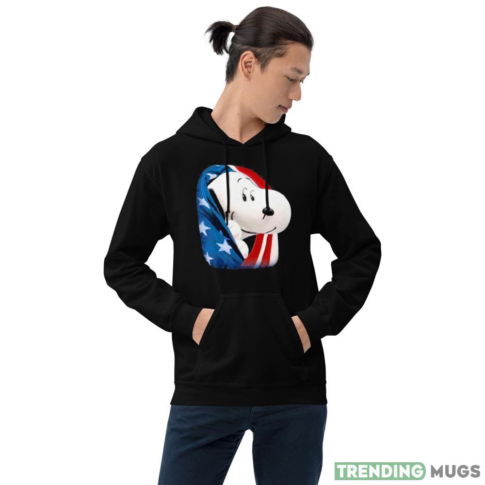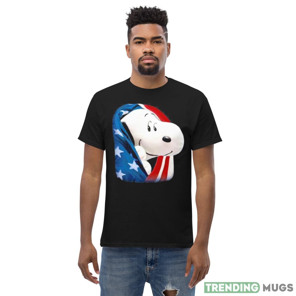 The sleek black color of this t-shirt is complemented by the iconic Snoopy design, which features the beloved cartoon character wearing a red, white, and blue hat with the American flag in the background. This design is perfect for those who want to celebrate their love for their country in a fun and playful way.