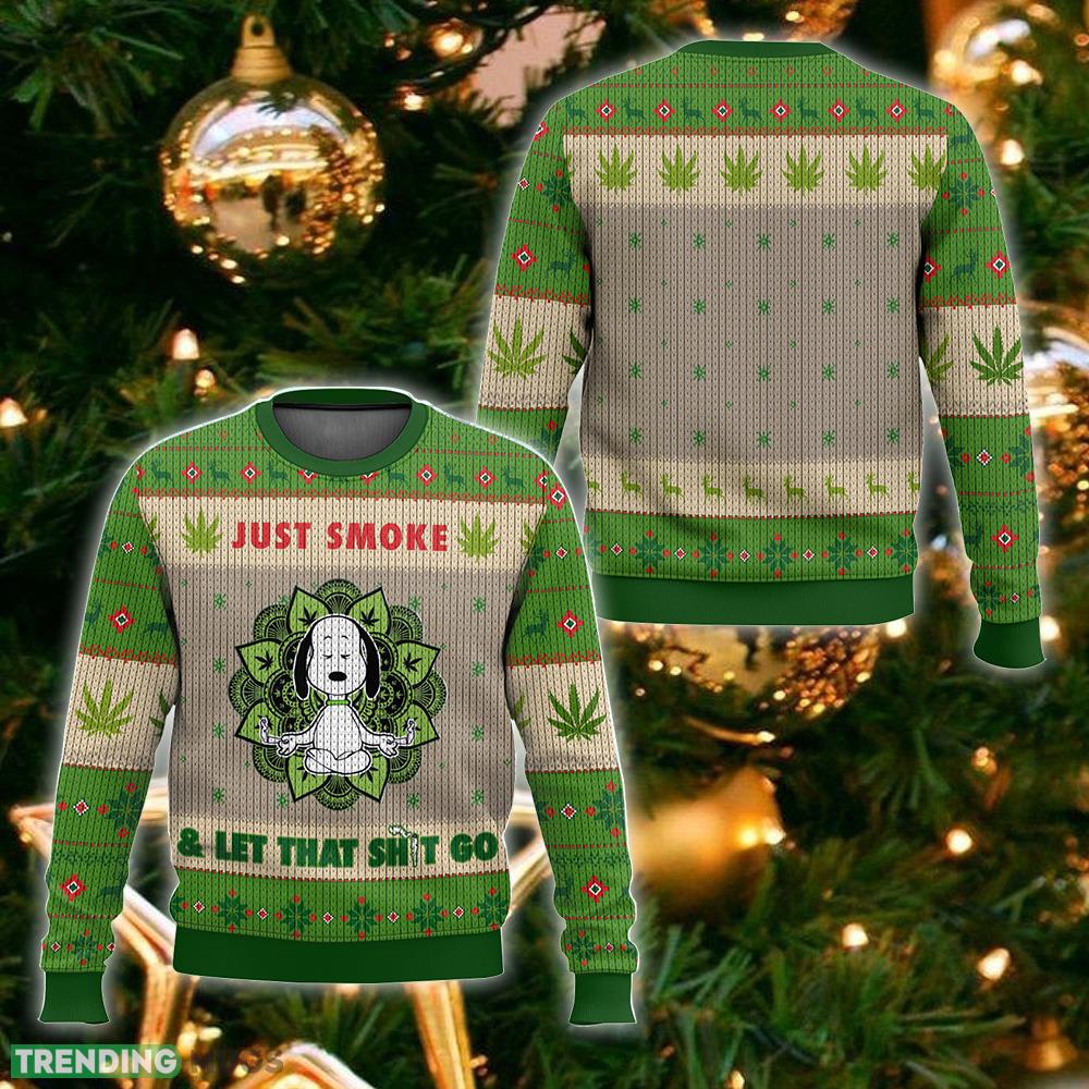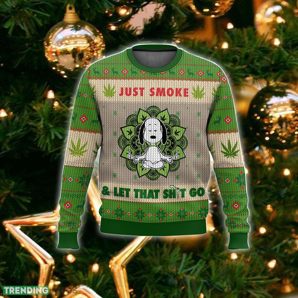 Featuring the iconic Snoopy character engaging in a yoga pose amidst a backdrop of weed leaves, this sweater is sure to turn heads and spark conversations at any holiday gathering. Crafted with utmost attention to detail, it boasts a cozy and comfortable fit, making it perfect for those chilly winter nights.
