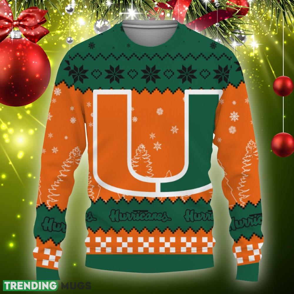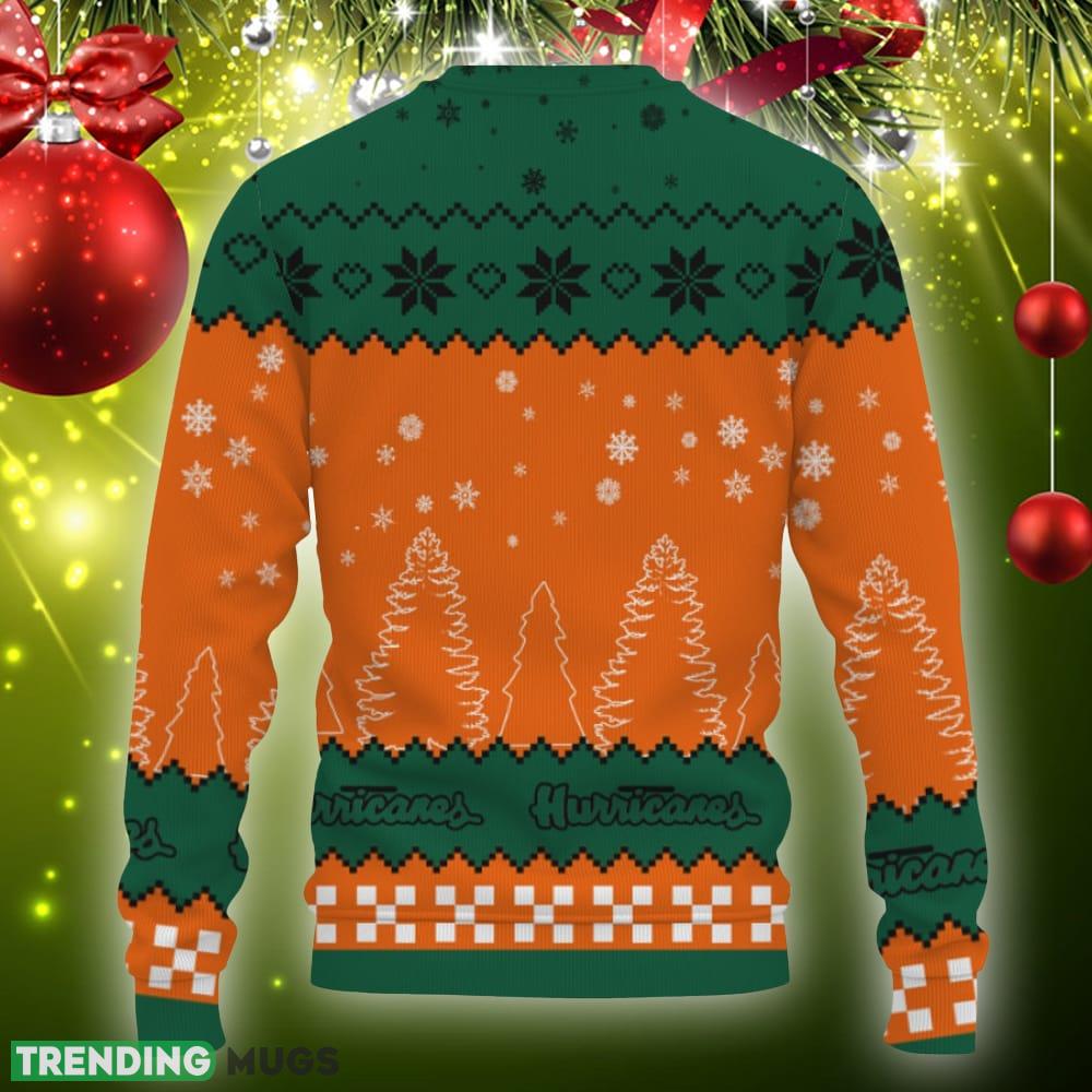 Featuring the iconic Miami Hurricanes team logo surrounded by a winter wonderland of snowflakes and a beautifully decorated Christmas tree, this sweater is a must-have for any fan looking to spread some holiday cheer. The vibrant colors and intricate design make it a standout piece that is sure to turn heads at any holiday gathering or game day event.