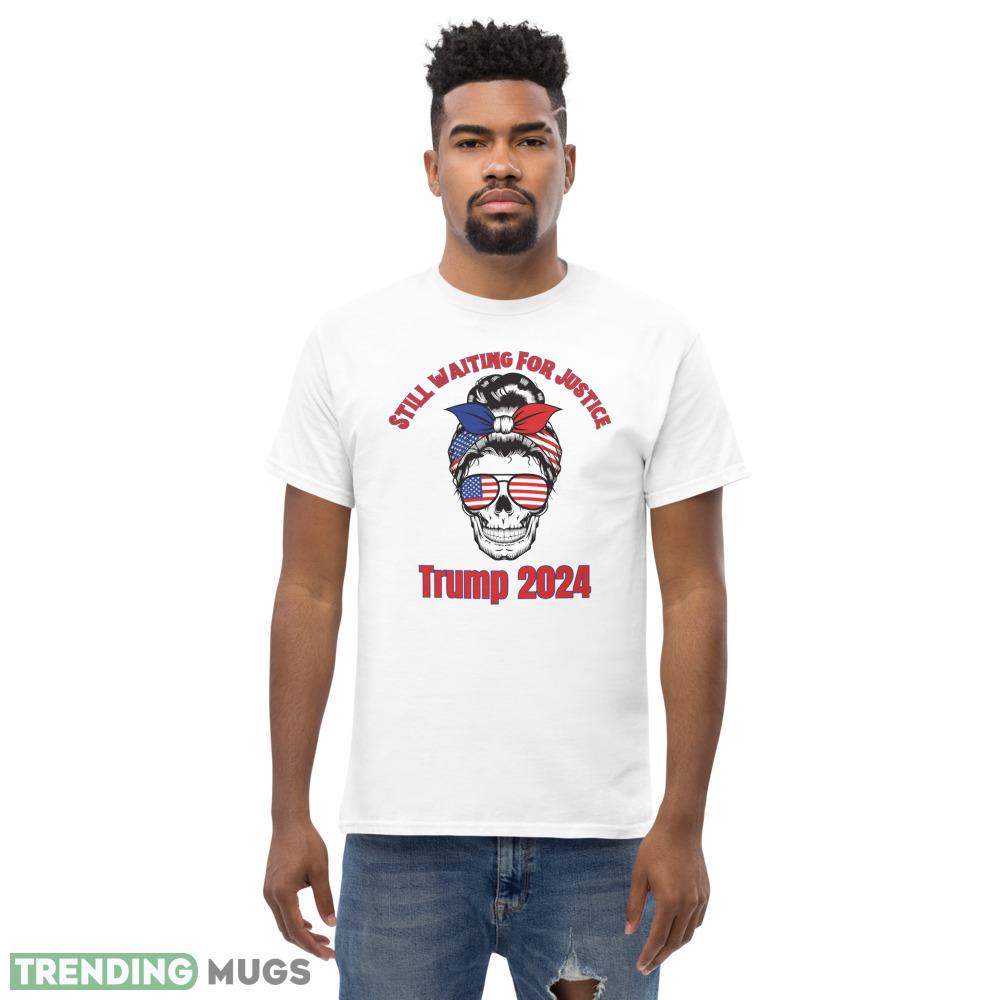 Still Waiting for Justice. Trump 2024. Skull with USA Flag Glasses and Bun. Classic T Shirt Details