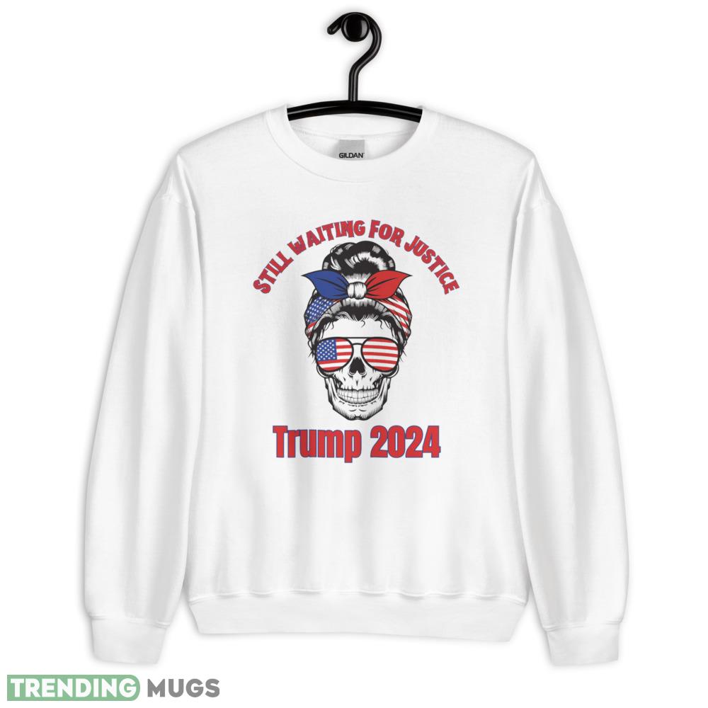 Still Waiting for Justice. Trump 2024. Skull with USA Flag Glasses and Bun. Classic T Shirt – 18000 Unisex Heavy Blend Crewneck Sweatshirt