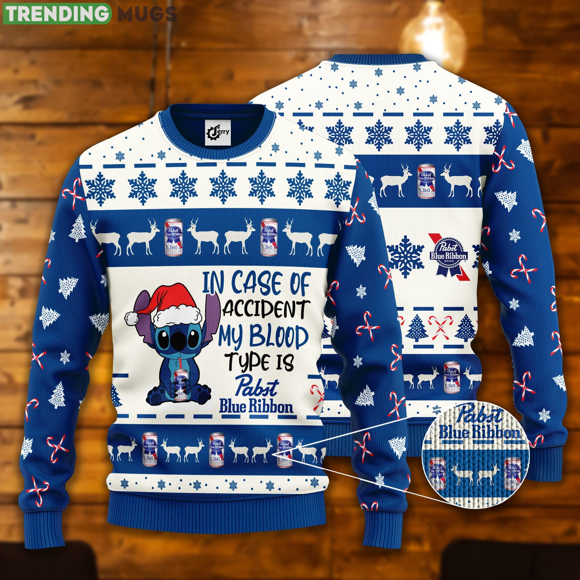 Stitch In Case Of Accident My Blood Type Is Pabst Blue Ribbon Ugly Christmas Sweater Informations: