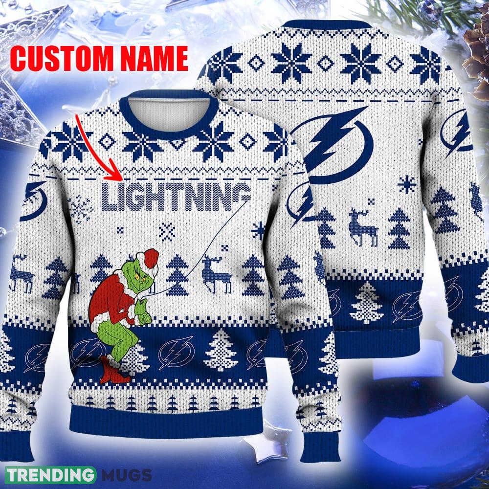 Get ready to spread some holiday cheer while showcasing your love for ice hockey and the Tampa Bay Lightning with our Tampa Bay Lightning Ugly Christmas Sweater Grinch Custom Ice Hockey NHL Gift For Christmas Holidays Custom Name!