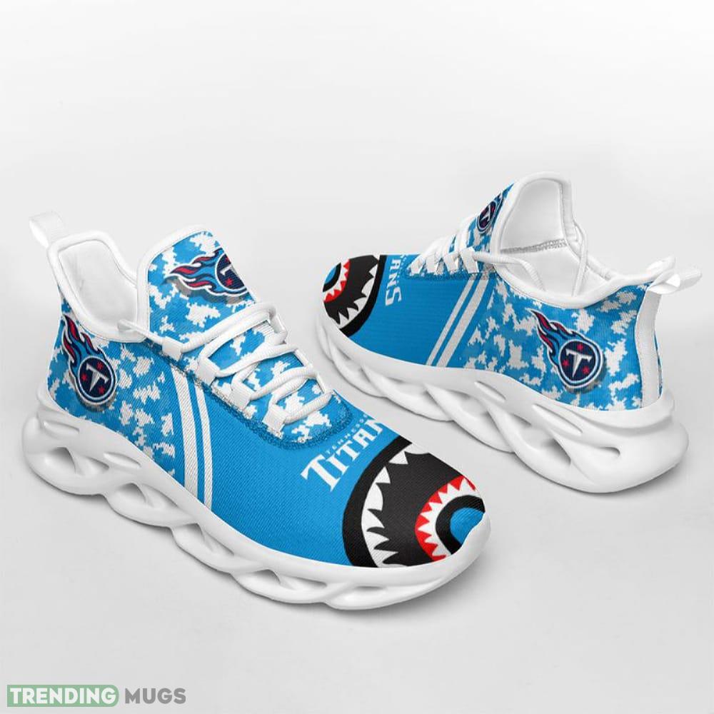 This Tennessee Titans Camo Bape Max Soul Black Or White Soles Shoes Runway Running Sports Sneakers is a breathable, lightweight, and comfortable casual outdoor shoe that has a unique design. It is made of a mesh fabric which makes it sweat absorbent and breathable, while the rubber bottom ensures traction, comfort, and durability. It is available in two colors: black or white sole. There are two styles of shoelace holes so you can choose your preference.