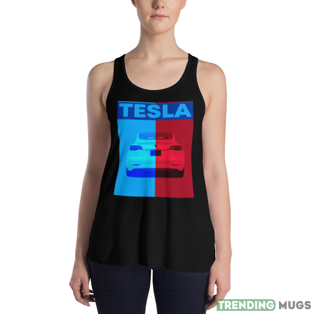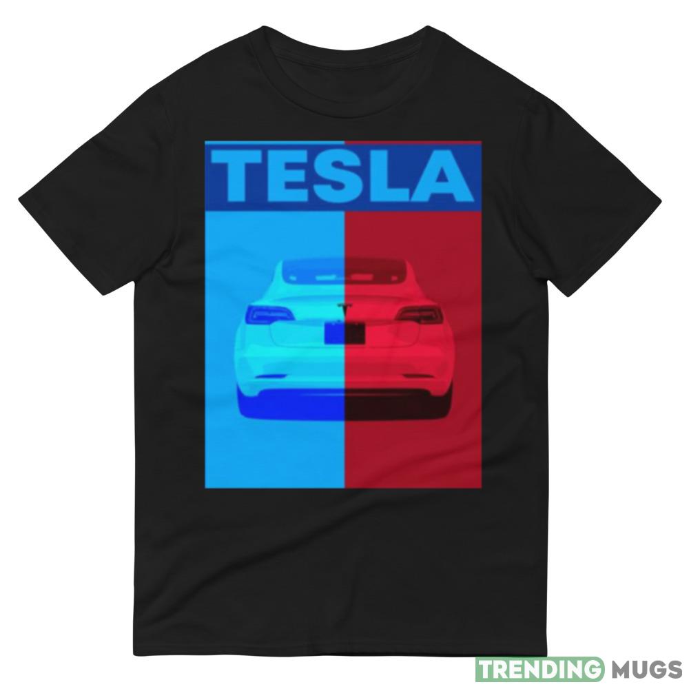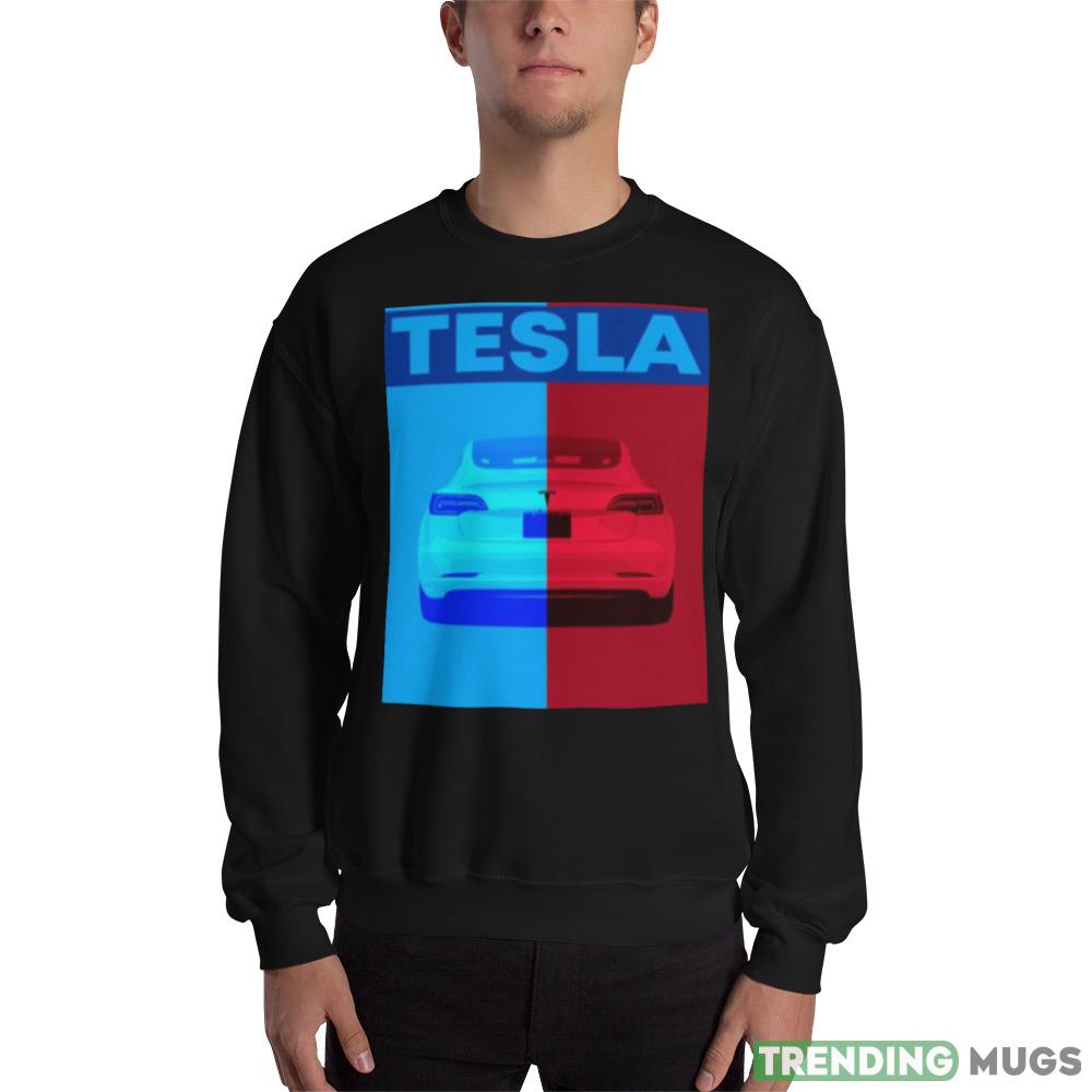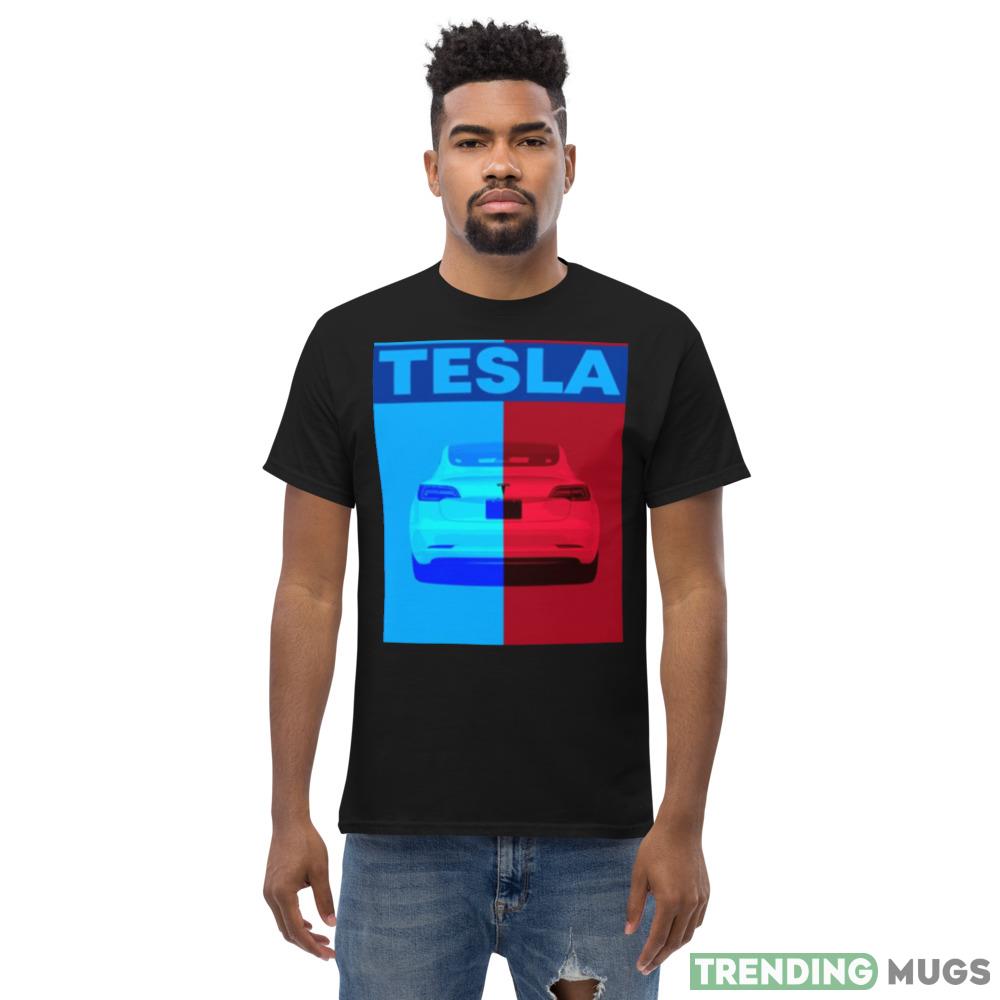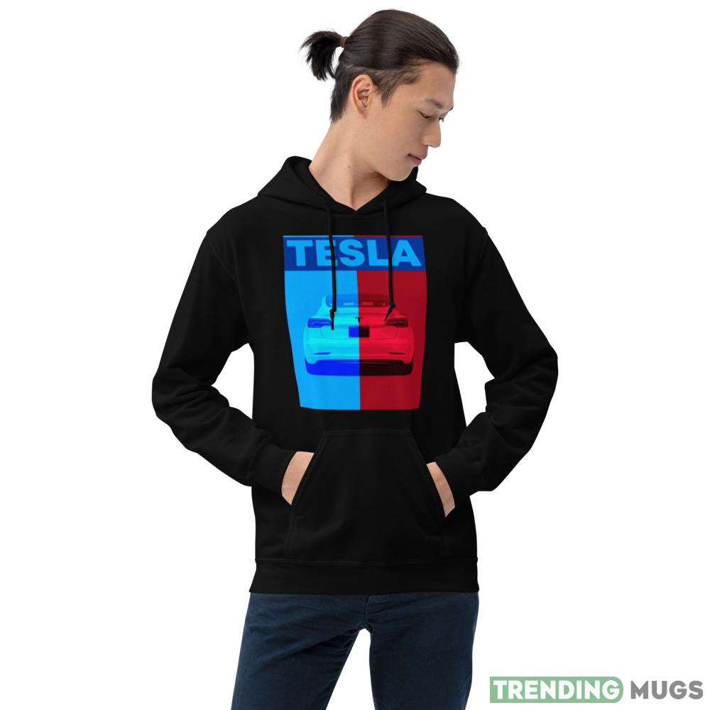 Crafted from high-quality materials, these shirts are made to last and will be a staple in your wardrobe for years to come. The unique design features a red and blue rear end of a Tesla car, with a beautiful art piece in the background that adds a pop of color and personality to your outfit.