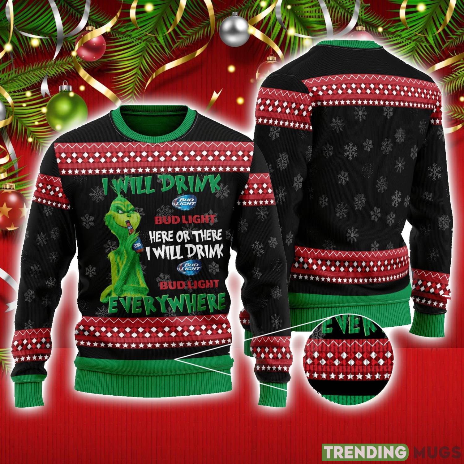 The Grinch I Will Drink Here Or There I Will Drink Bud Light Everywhere Ugly Christmas Sweater Christmas Gift Ideas Informations: