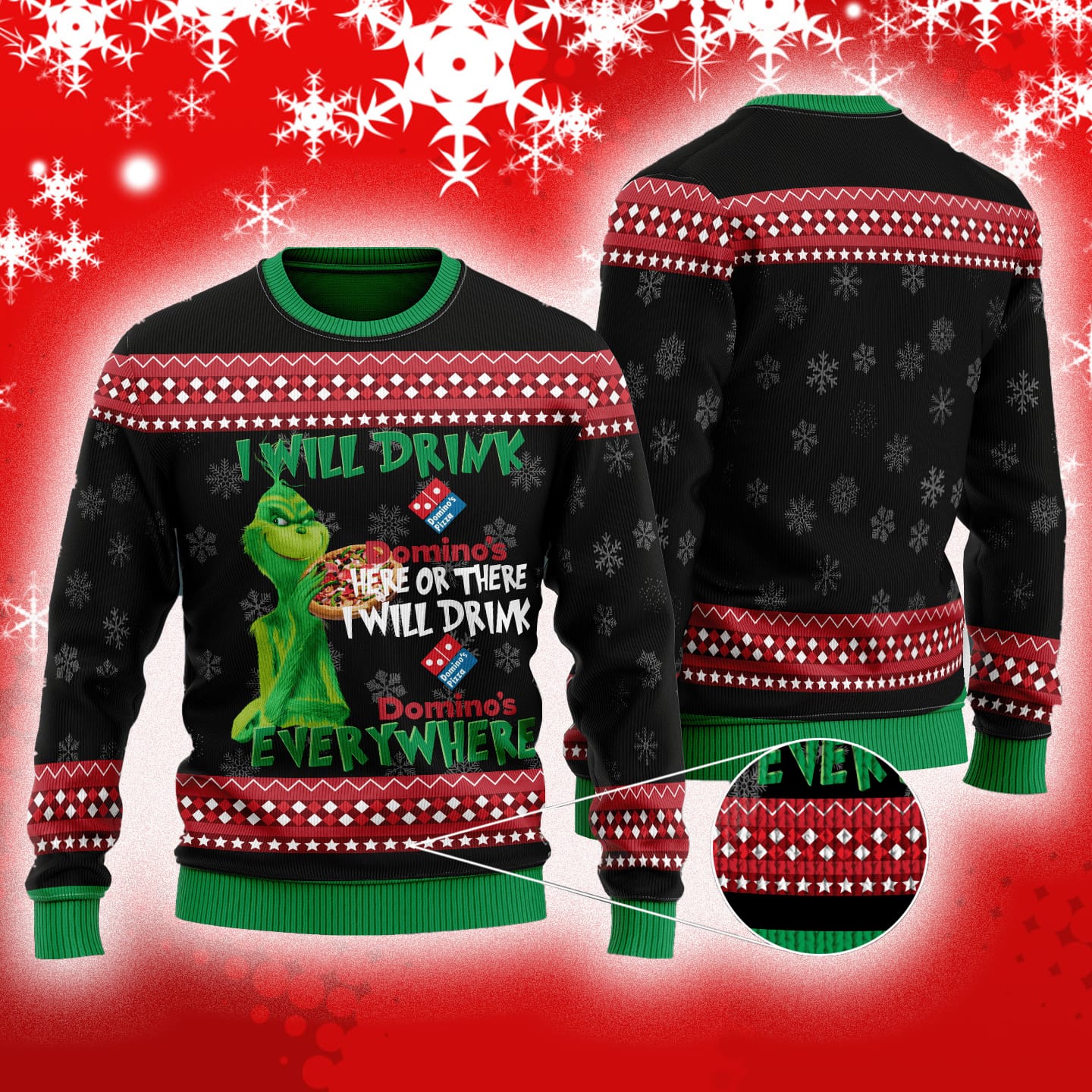 The Grinch I Will Drink Here Or There I Will Drink Domino’s Pizza Everywhere Ugly Christmas Sweater For Men And Women Gift Informations: