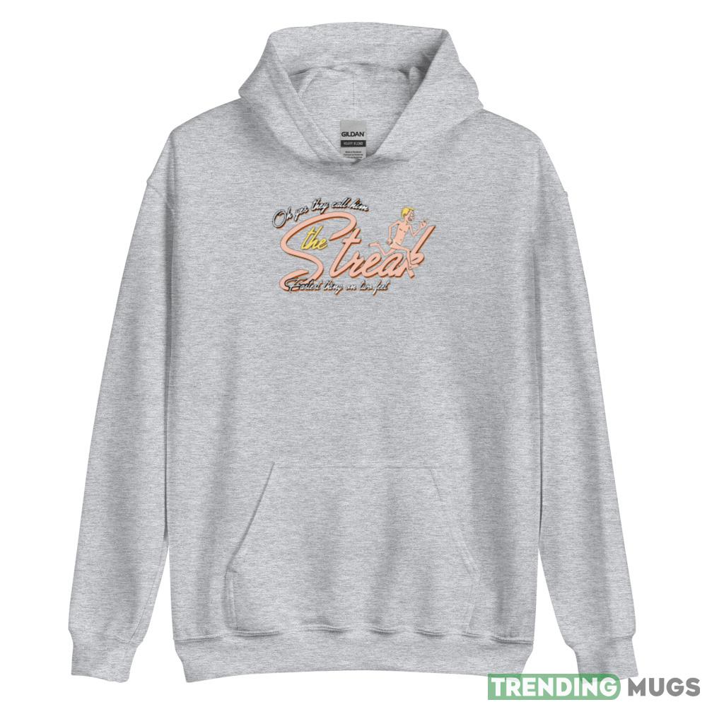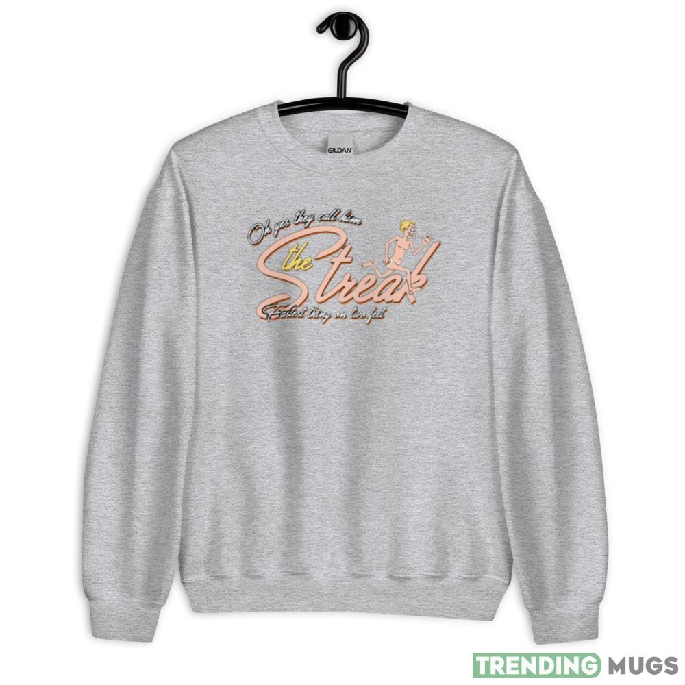 Looking for a way to show off your love for running and music? Look no further than The Streak from Ray Stevens running man T-Shirt! This eye-catching tee features a bold graphic of a runner mid-stride, with the iconic lyrics to Ray Stevens’ hit song “The Streak” emblazoned in bold letters above and below.