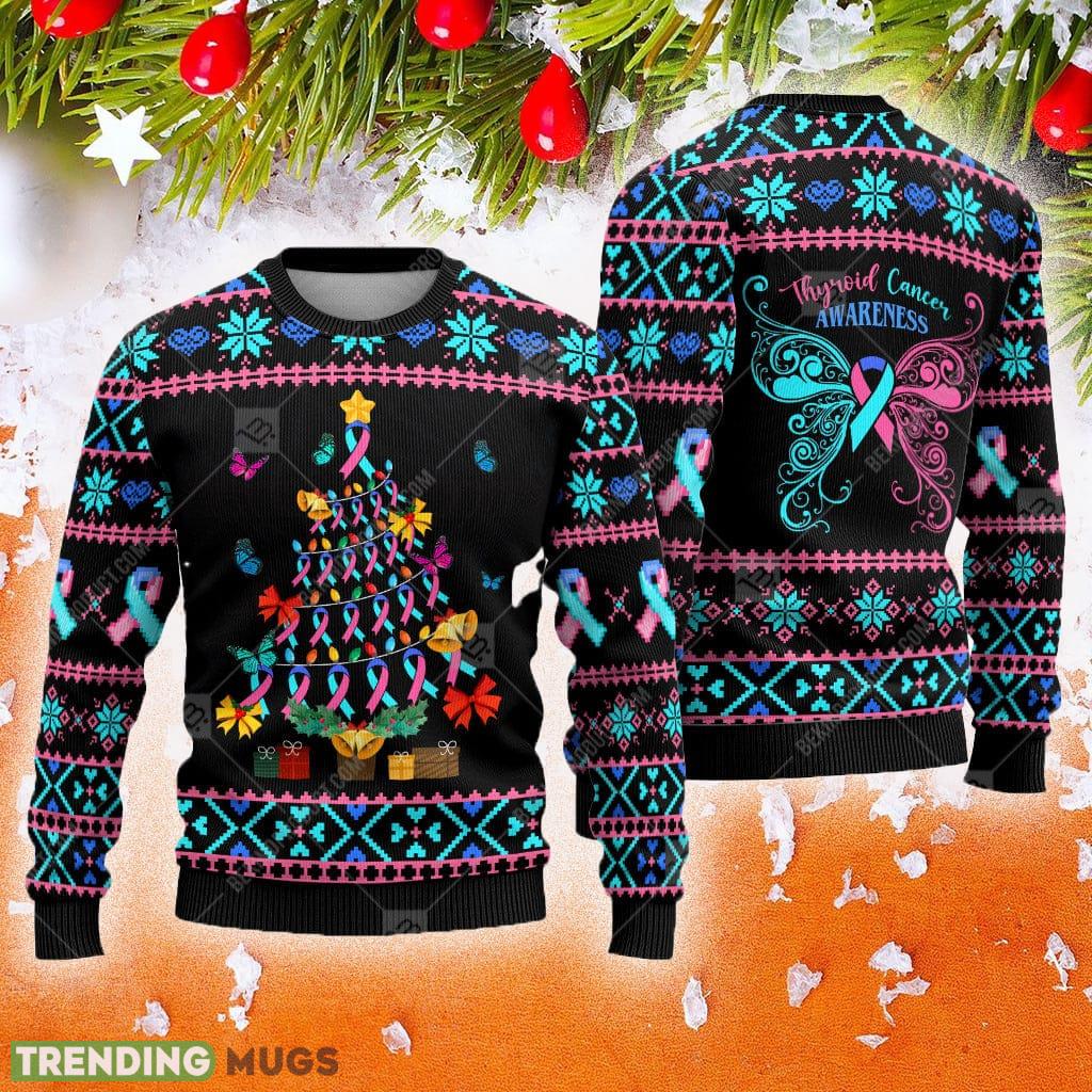 Thyroid Cancer Awareness Ribbon Tree Gift Box Animals Ugly Christmas Sweater AOP Gift For Men And Women Informations: