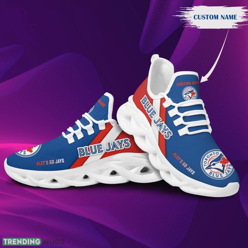 Featuring the iconic Toronto Blue Jays logo prominently displayed on the side, these shoes are a stylish way to support your favorite team. The custom name pattern adds a personalized touch, making these sneakers truly one-of-a-kind.