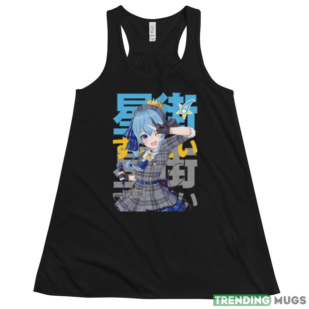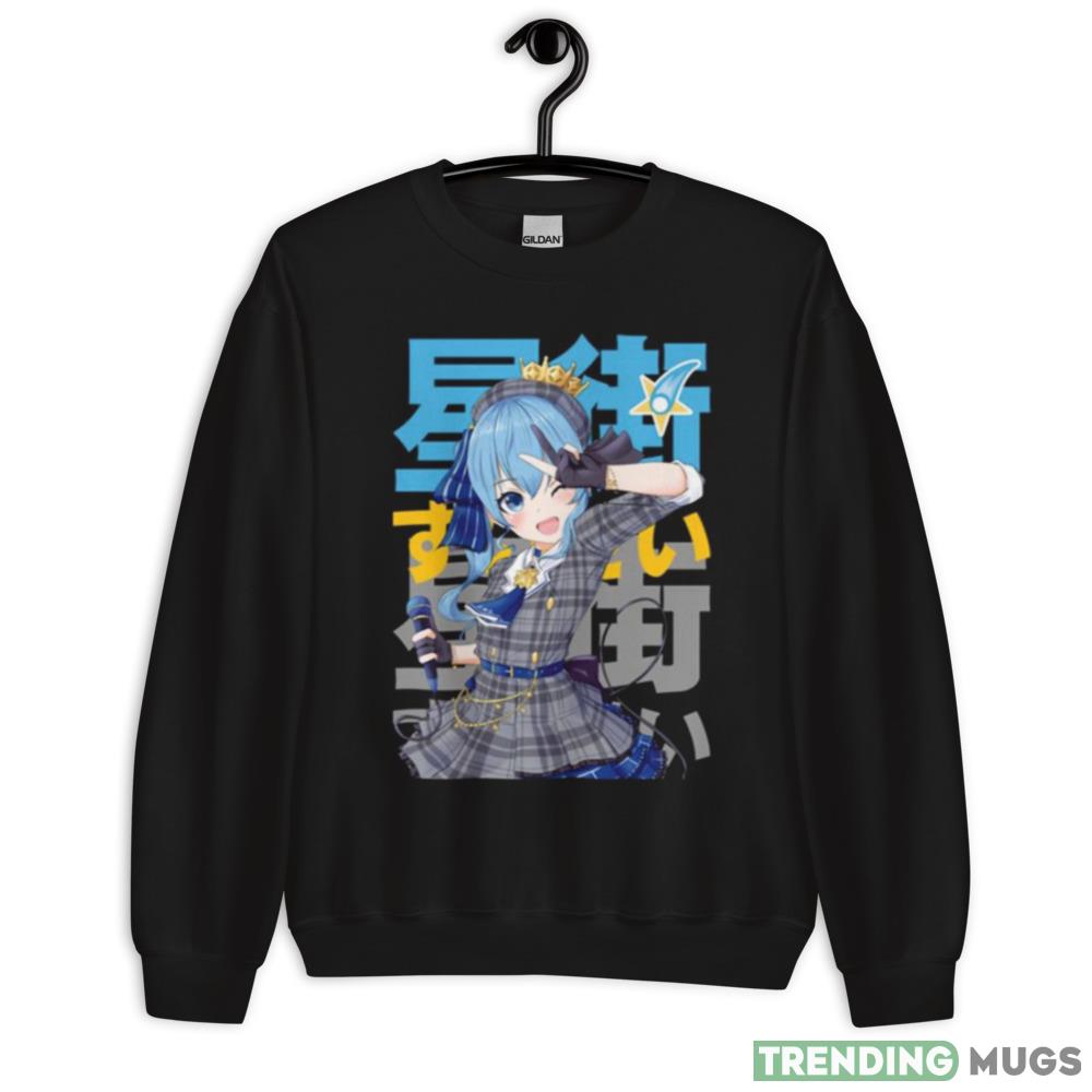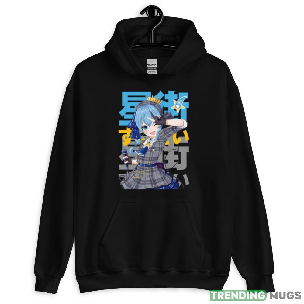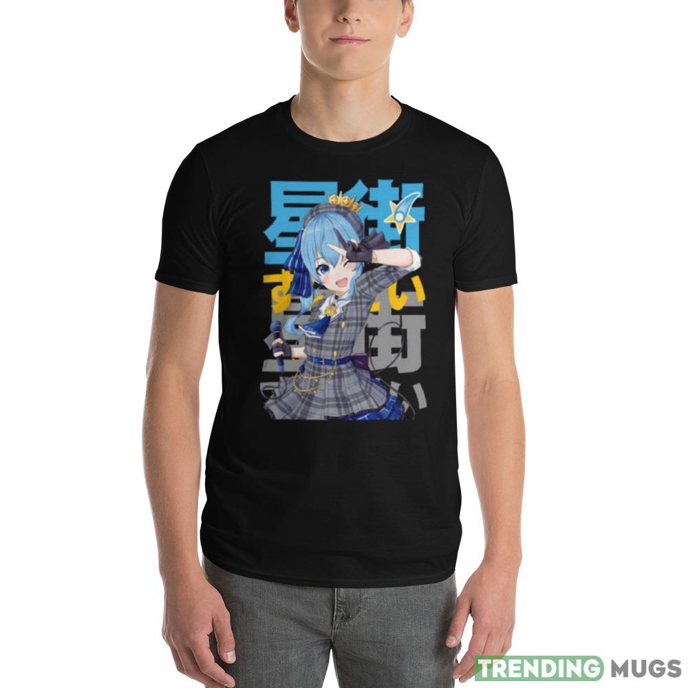 The eye-catching typography on the shirt is sure to turn heads and make a statement. The vibrant colors and intricate design make this shirt a true work of art. Whether you’re a fan of Hoshimachi Suisei or simply appreciate great design, this shirt is a must-have addition to your wardrobe.