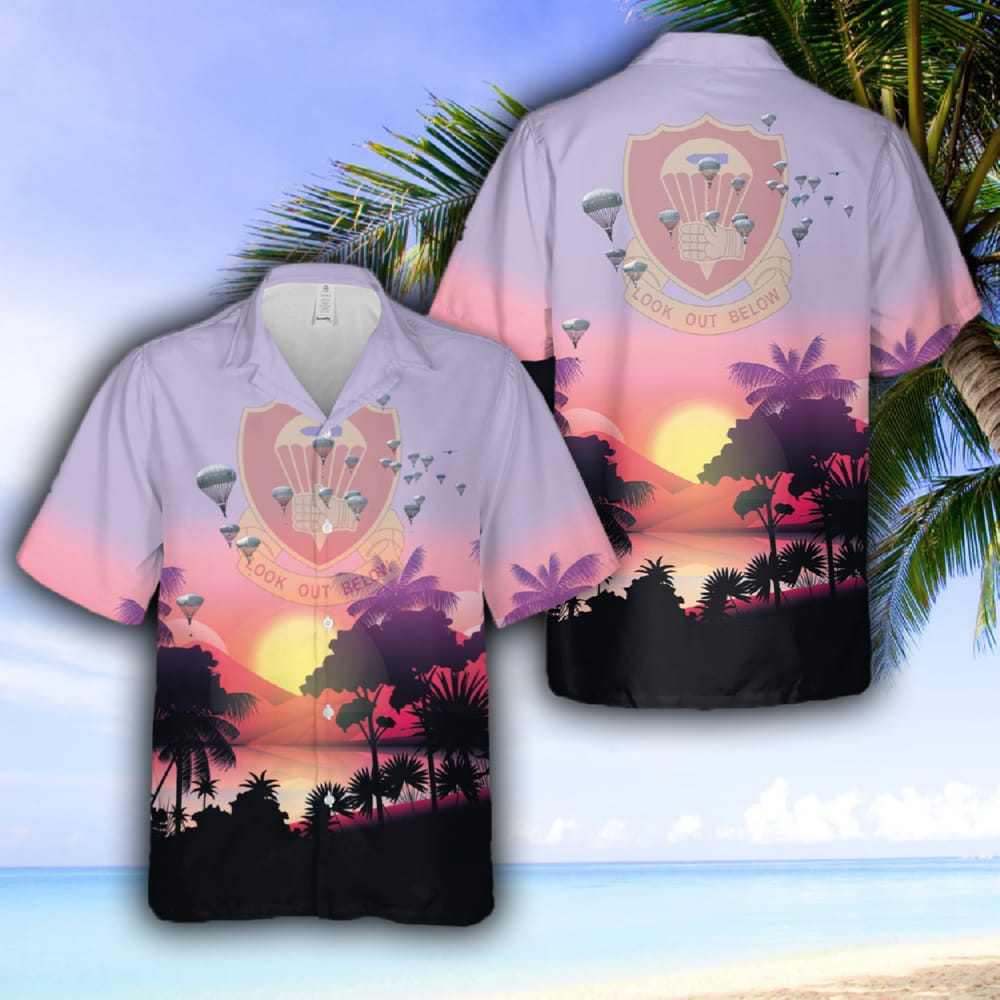 Crafted with meticulous attention to detail, this Hawaiian shirt features a vibrant and vivid design that depicts the iconic moment of the 377th Parachute Field Artillery Regiment’s daring jump from a C-130 Hercules aircraft. The image captures the thrill and bravery of these soldiers, making it a perfect choice for those who want to pay homage to their courage.