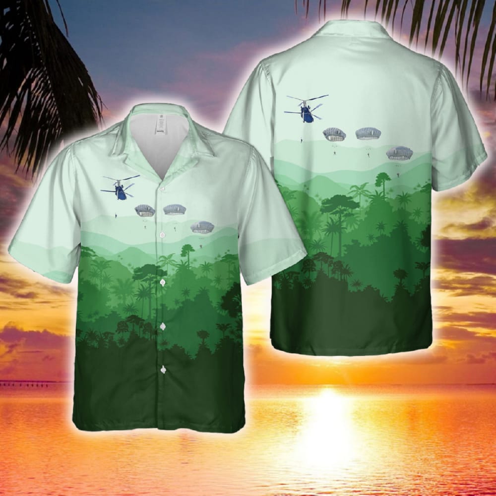 Step into military style with our US Army Paratroopers Hawaiian Shirt! This unique garment captures a thrilling moment as paratroopers fearlessly jump from a CH-47 Chinook Helicopter onto the Bunker Drop Zone in Grafenwoehr Training Area, Germany.
