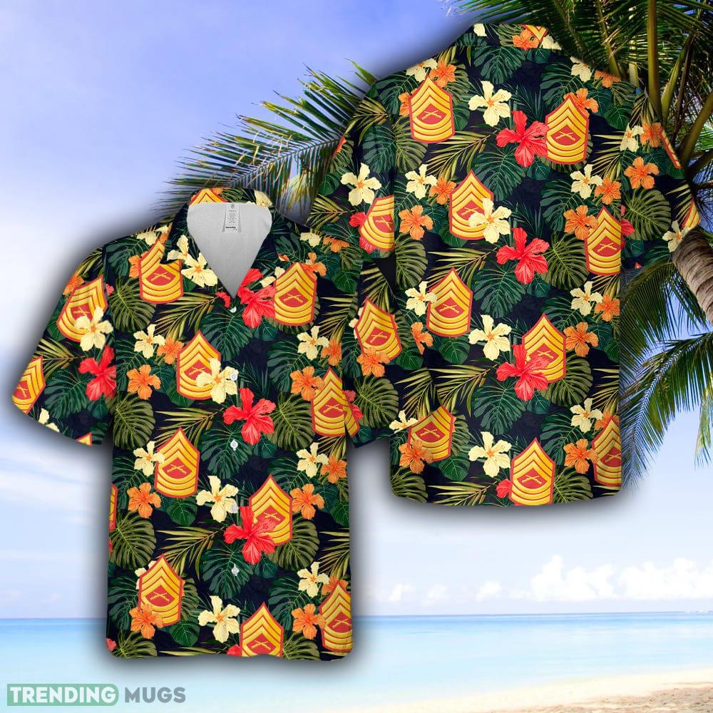 Crafted with utmost precision, this shirt features the iconic red and gold chevron rank insignia of a Master Sergeant, beautifully displayed against a backdrop of tropical Hawaiian patterns. It’s the perfect blend of military pride and island paradise, making it an absolute must-have for any Marine or proud supporter.