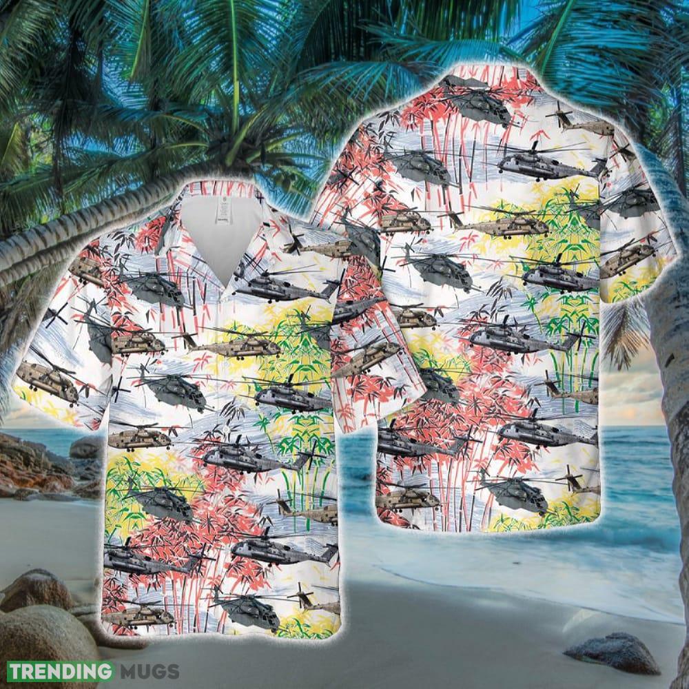 Crafted with utmost attention to detail, this Hawaiian shirt showcases an array of vibrant colors and intricate patterns, creating a striking visual representation of these remarkable aircraft. The bold and eye-catching prints feature the CH-53E Super Stallion and MH-53E Sea Dragon helicopters in action, soaring through the skies with unparalleled grace and strength.