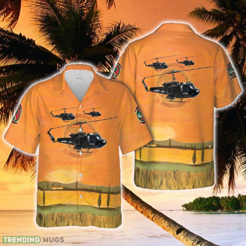 Designed to make a statement, this Hawaiian shirt is adorned with vibrant colors, depicting the beautiful landscapes of Hawaii. The intricate design captures the essence of the UH-1N Huey, paying homage to the brave men and women who have served in the USMC HMLA-367.